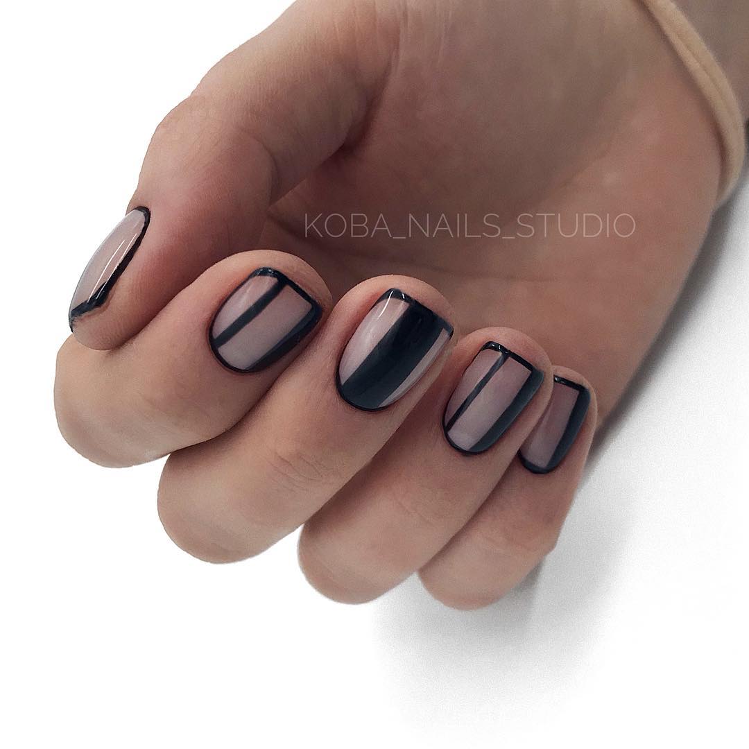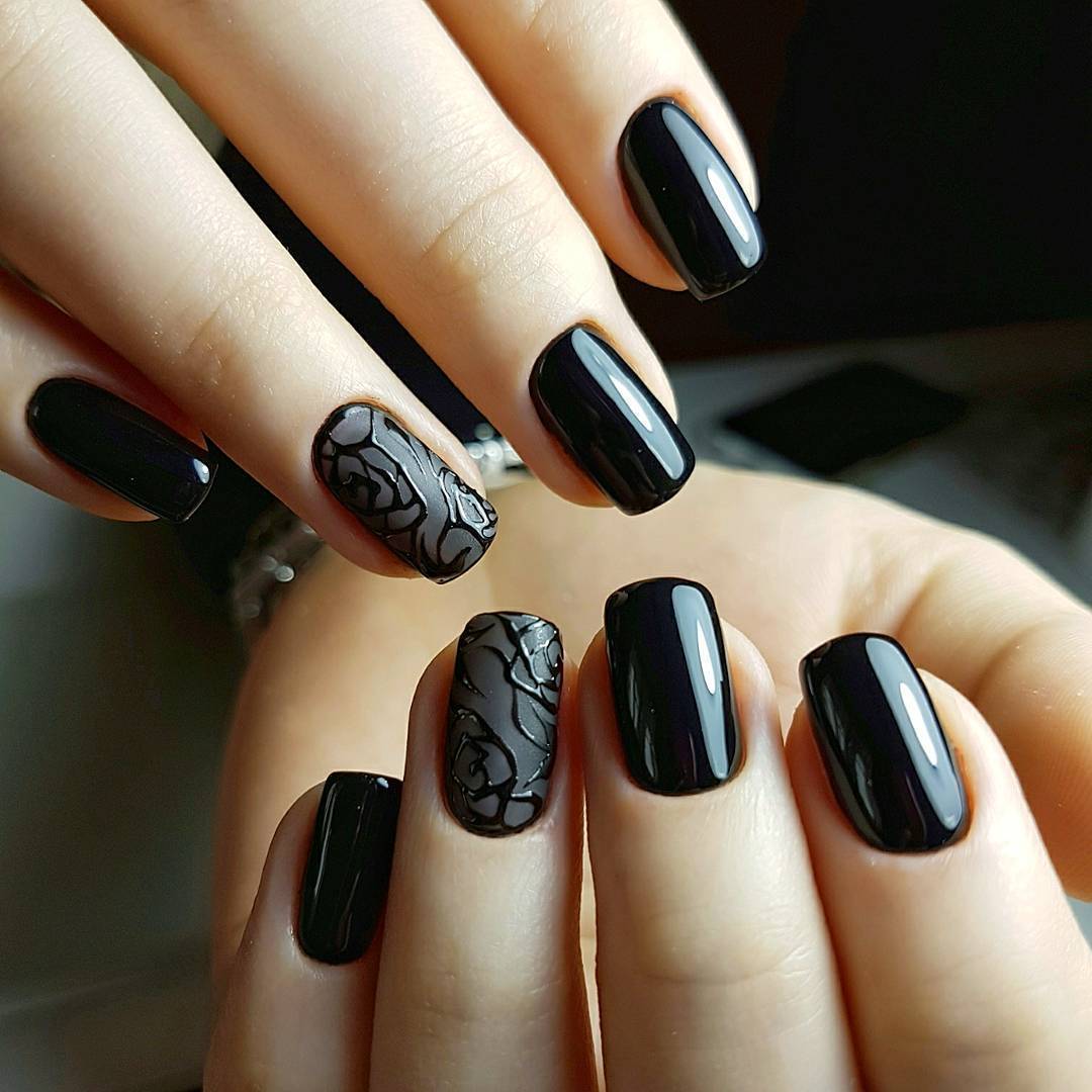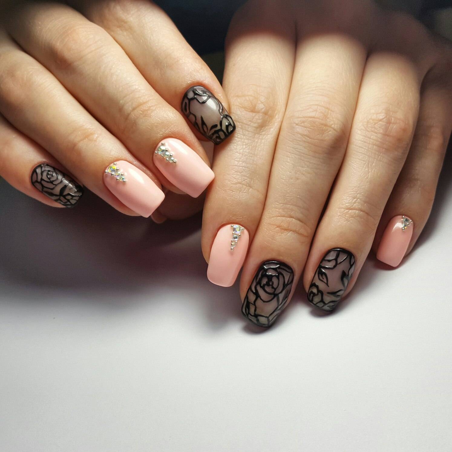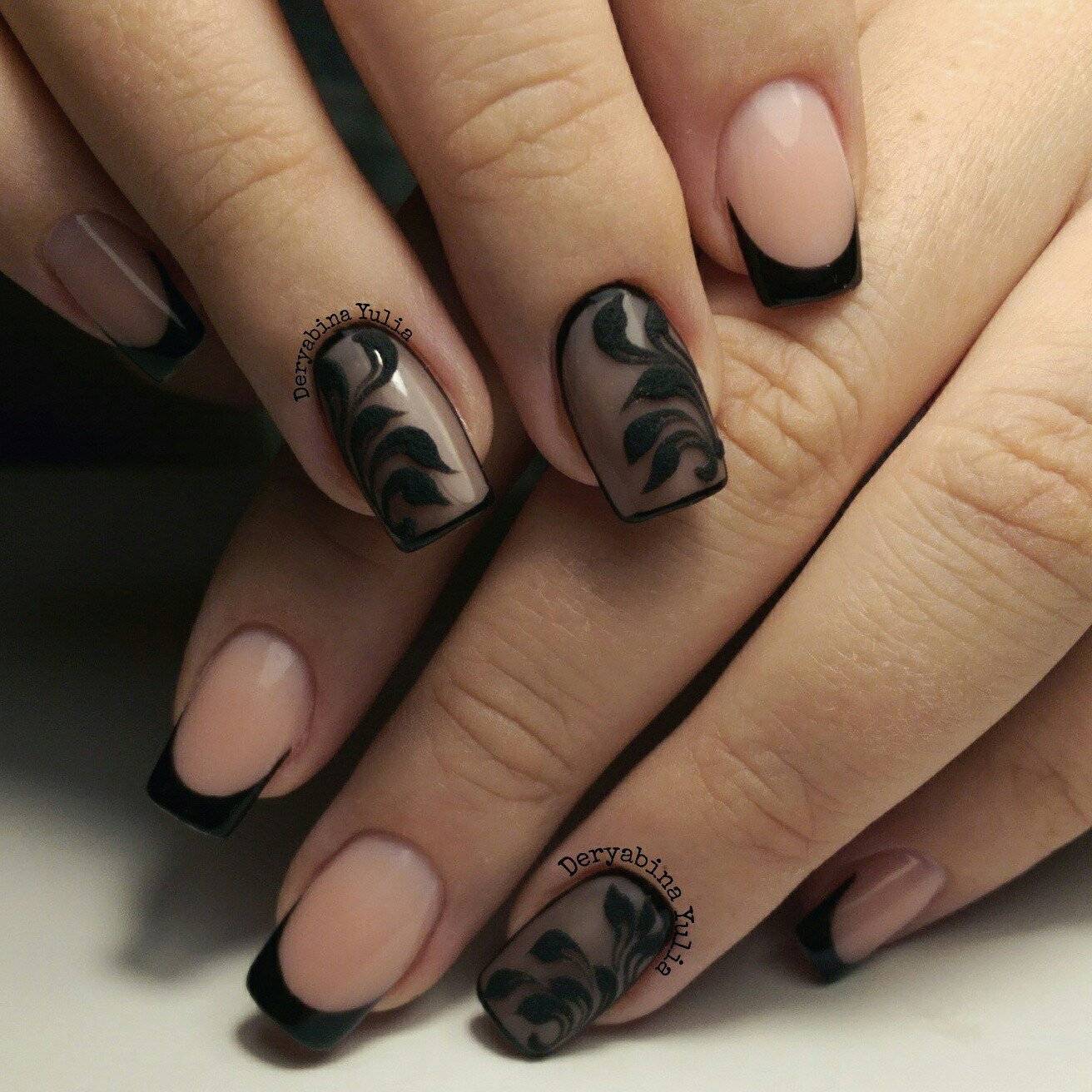 Любой дизайн начинается с технической обработки кутикулы, коррекции длины и удаления ороговевших участков. После чего идет художественная обработка пальчиков и нанесение покрытий и декора. Мы уже упоминали о том, что черную краску можно смешивать с топом или базой. Стилисты рекомендуют выбирать базовое покрытие для смешивания и росписи ногтей.