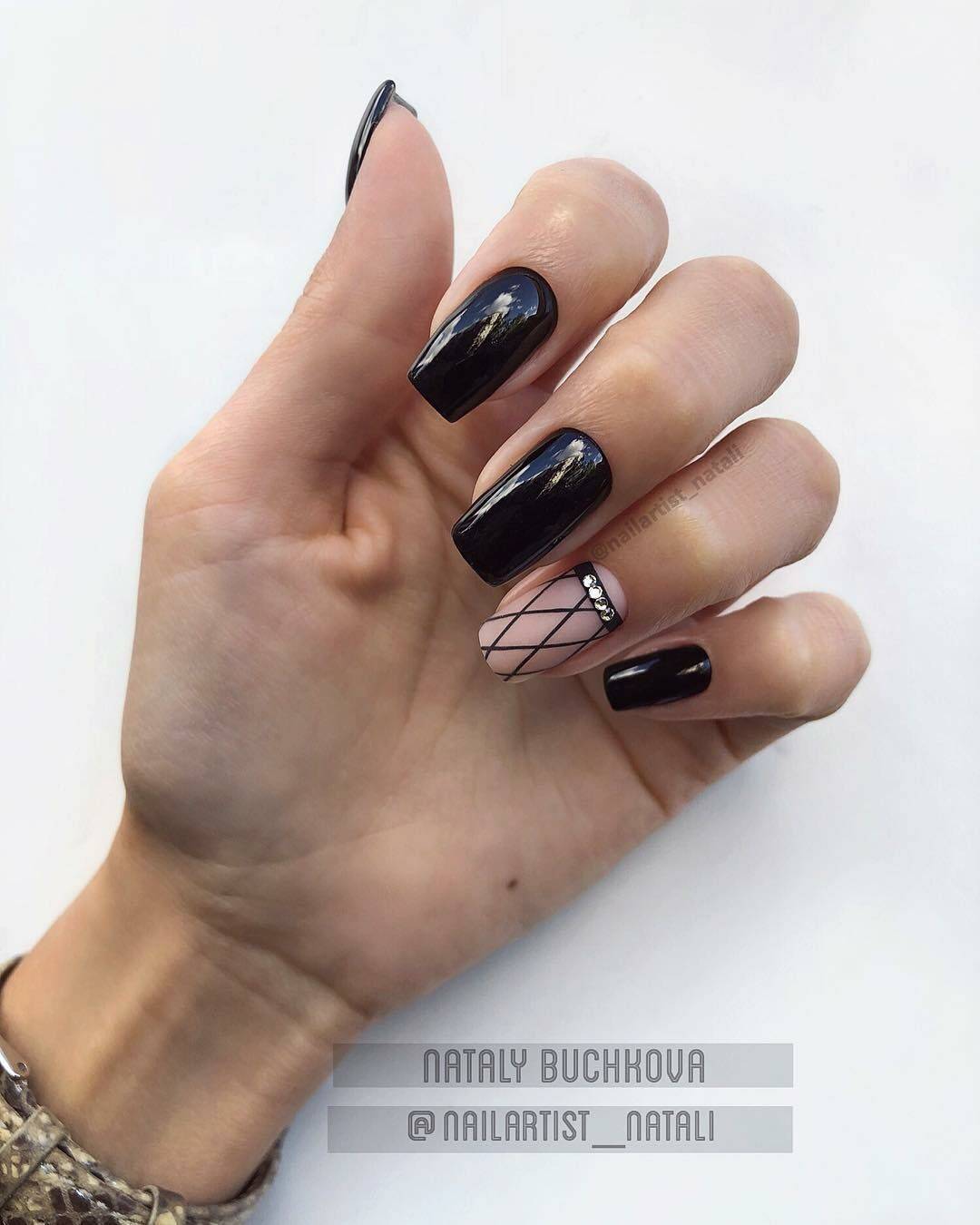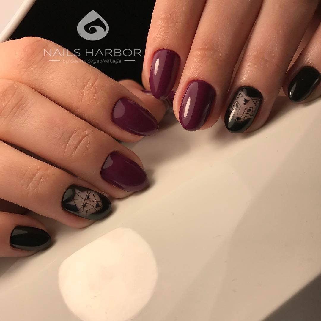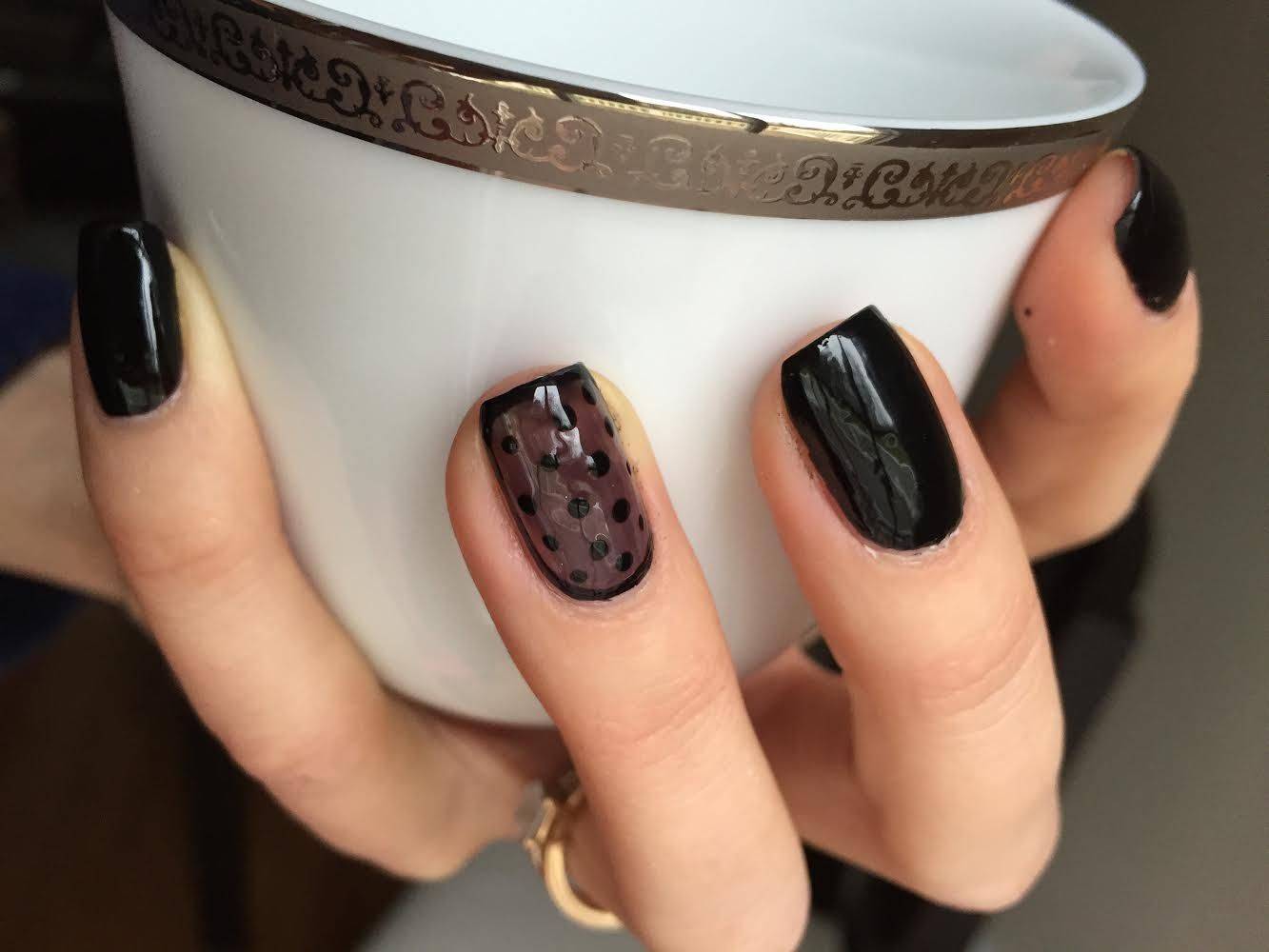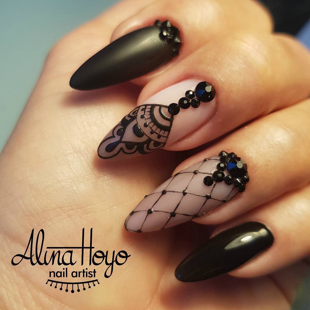 Любой дизайн начинается с технической обработки кутикулы, коррекции длины и удаления ороговевших участков. После чего идет художественная обработка пальчиков и нанесение покрытий и декора. Мы уже упоминали о том, что черную краску можно смешивать с топом или базой. Стилисты рекомендуют выбирать базовое покрытие для смешивания и росписи ногтей.