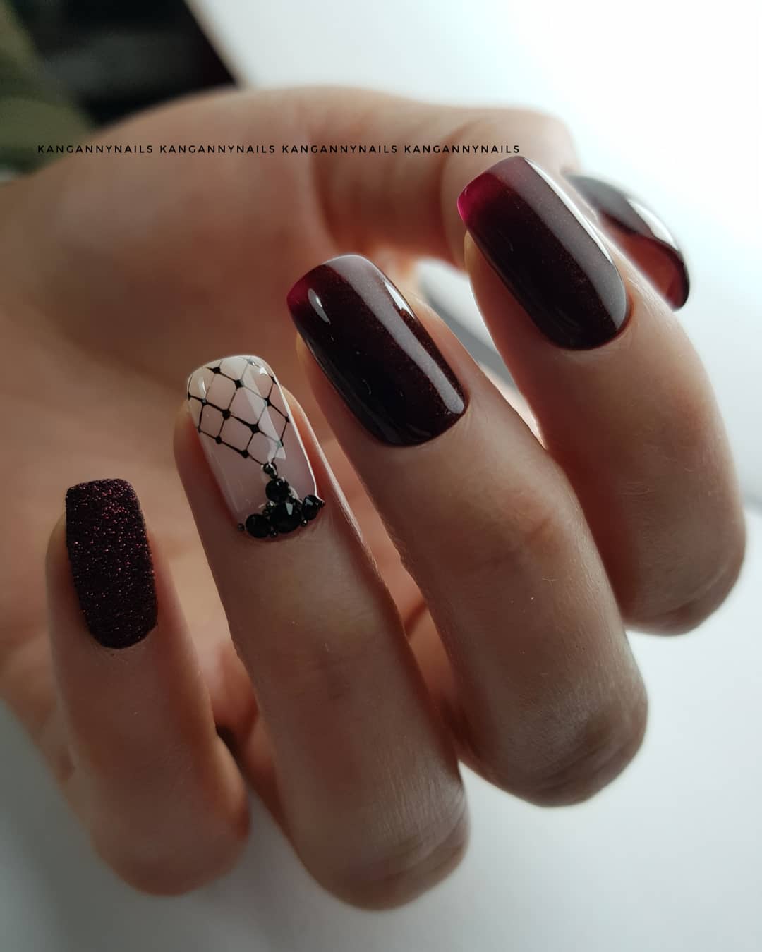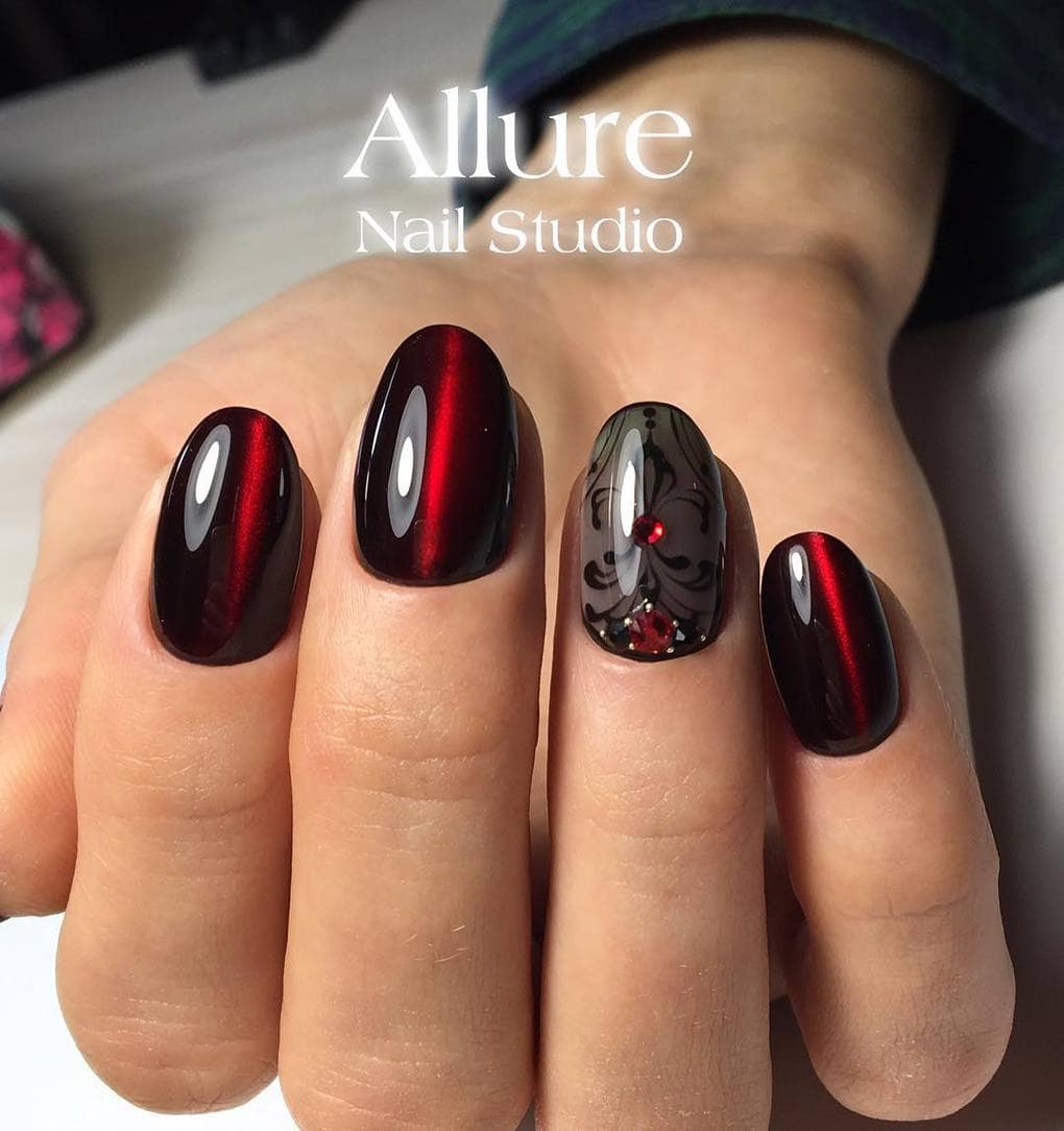 - Классический вариант маникюра можно украсить стразами, блестками, фигурками и прочим декором и смело отправляться на званый ужин. Красные тона подчеркнут решительность и яркую индивидуальность женщины, будь она на работе или в магазине. Черно-белые тона подойдут для носки на каждый день.