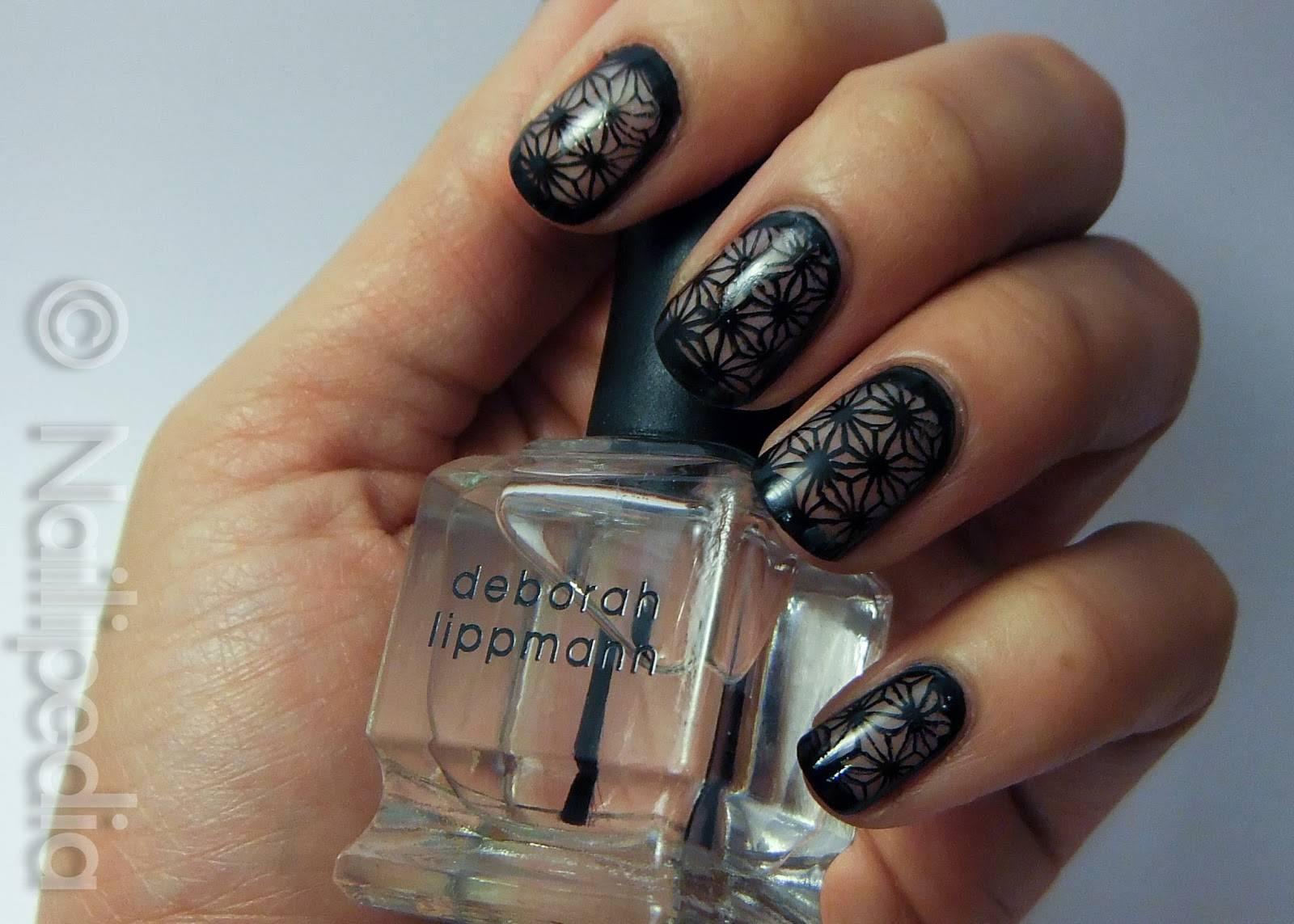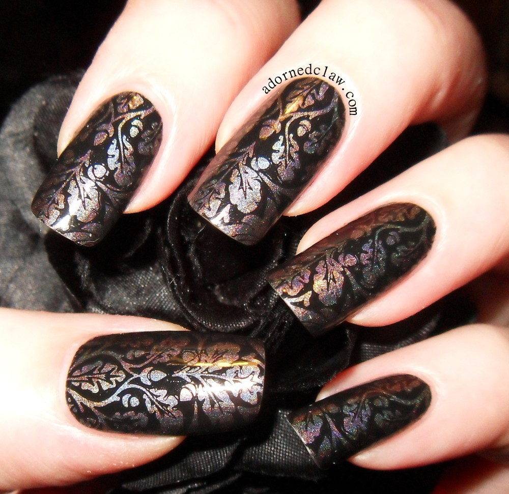 - После этого фон выслушивается в лампе. Таким образом ноготки станут с сероватым или прозрачным черным витражным оттенком. Далее, необходимо выбрать пластины для стемпинга. Лучше всего выбирать рисунок с не очень толстыми, не особо большими, а тонкими линиями, которые напоминают кружева или вуаль, колготки.