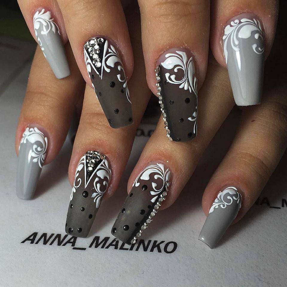 - Тонкой кистью или специальными маникюрными инструментами прорисовать узор. Начинать лучше прорисовку с крупных элементов, постепенно переходя к мелким. К данному дизайну не относится правило «чем больше, тем лучше». Излишняя плотность рисунка или перегрузка узорами может испортить впечатление и рассеять эффект «воздушной вуали». Вполне достаточно сделать один изящный элемент или сеточку с точками, которая будет имитировать женские колготки. Красиво смотрится «кружево» с узором не плотного цвета, а полупрозрачного или на тон темнее дымки. Также можно использовать в качестве дополнительного декора стразы, наклейки, бусинки, блески.