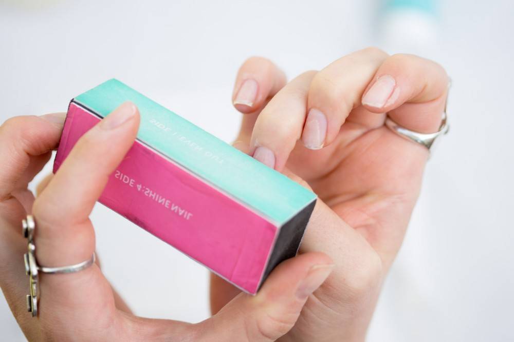 - Необходимо подготовить ногти стандартным образом к покрытию гель-лаком. Для этого убирается птеригий, срезается или пришлифовывается фрезами кутикула, отодвигаются боковые валики. Если это первичное покрытие, то снимается натуральный блеск с ногтя при помощи бафа или мягкой пилки, крупностью 180 грит.