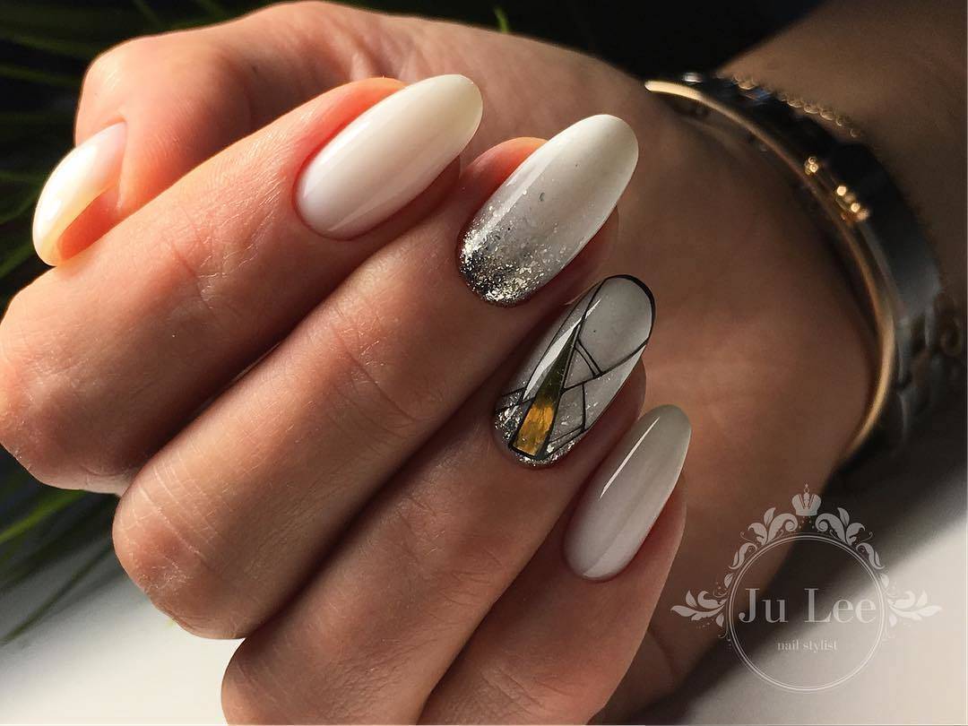 - Градиент. Сочетание двух или трех просвечивающихся оттенков обеспечивает максимально плавные переходы (для кончиков ногтей стоит взять молочный или белый). С плотными цветами такого эффекта не добиться.