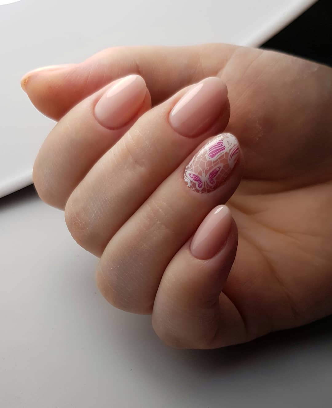 Рисунок получится красивым и аккуратным — если у вас пока недостаточно навыков, чтобы изобразить кружево своими руками, это будет отличным выходом из ситуации. А нейтральные светлые оттенки обеспечат маникюру опрятность, которой в случае с оформлением коротких ногтей бывает сложно добиться.