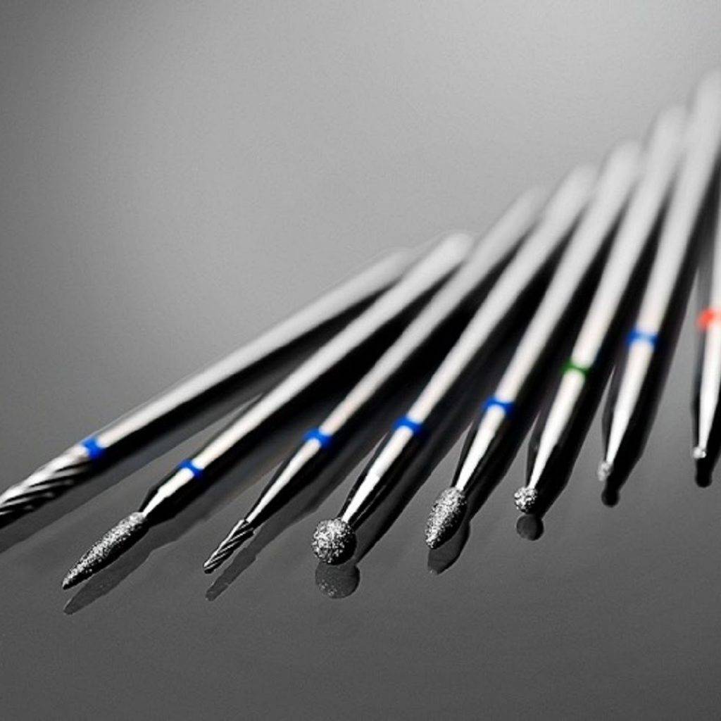 Обучение аппаратному маникюру не требует большого количества насадок. Для домашнего использования будет достаточно 2-3 фрез в форме конуса из керамики. Они не нагреваются, следовательно, не доставляют дискомфорта. Красная маркировка говорит о малой абразивности, синяя — о средней.