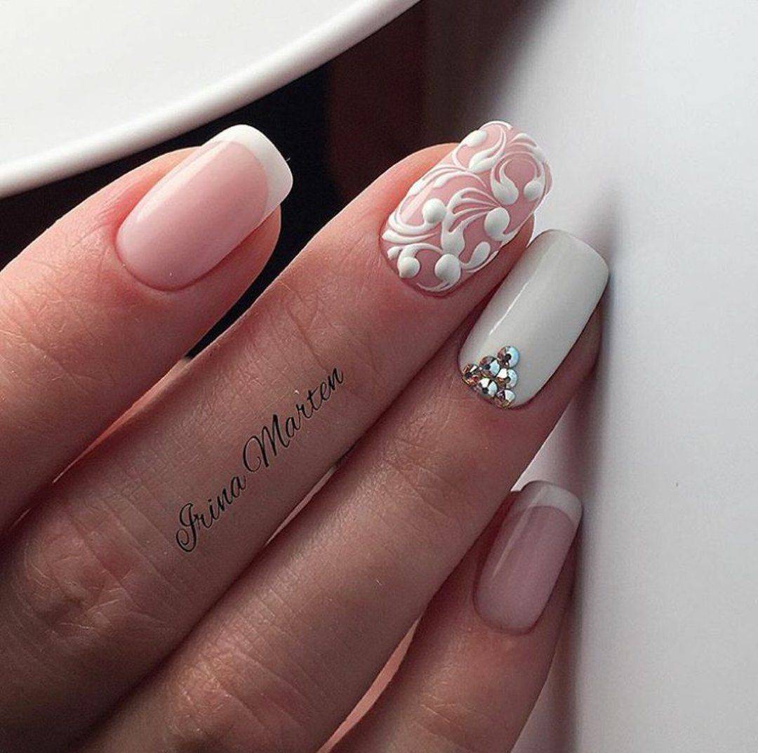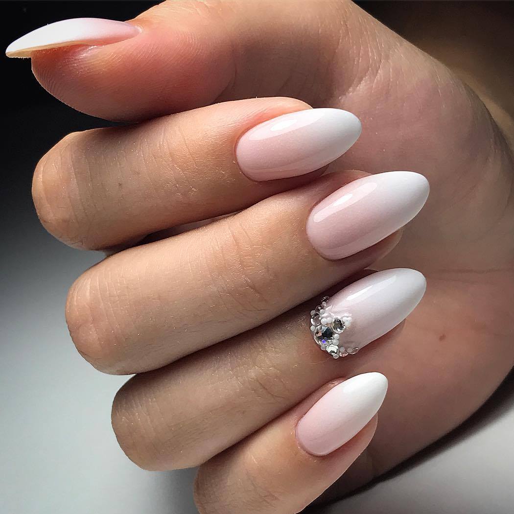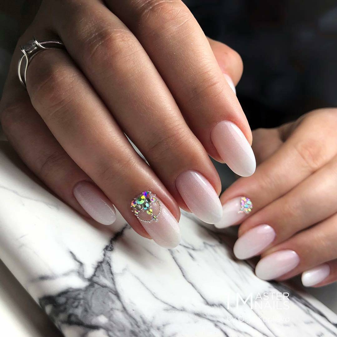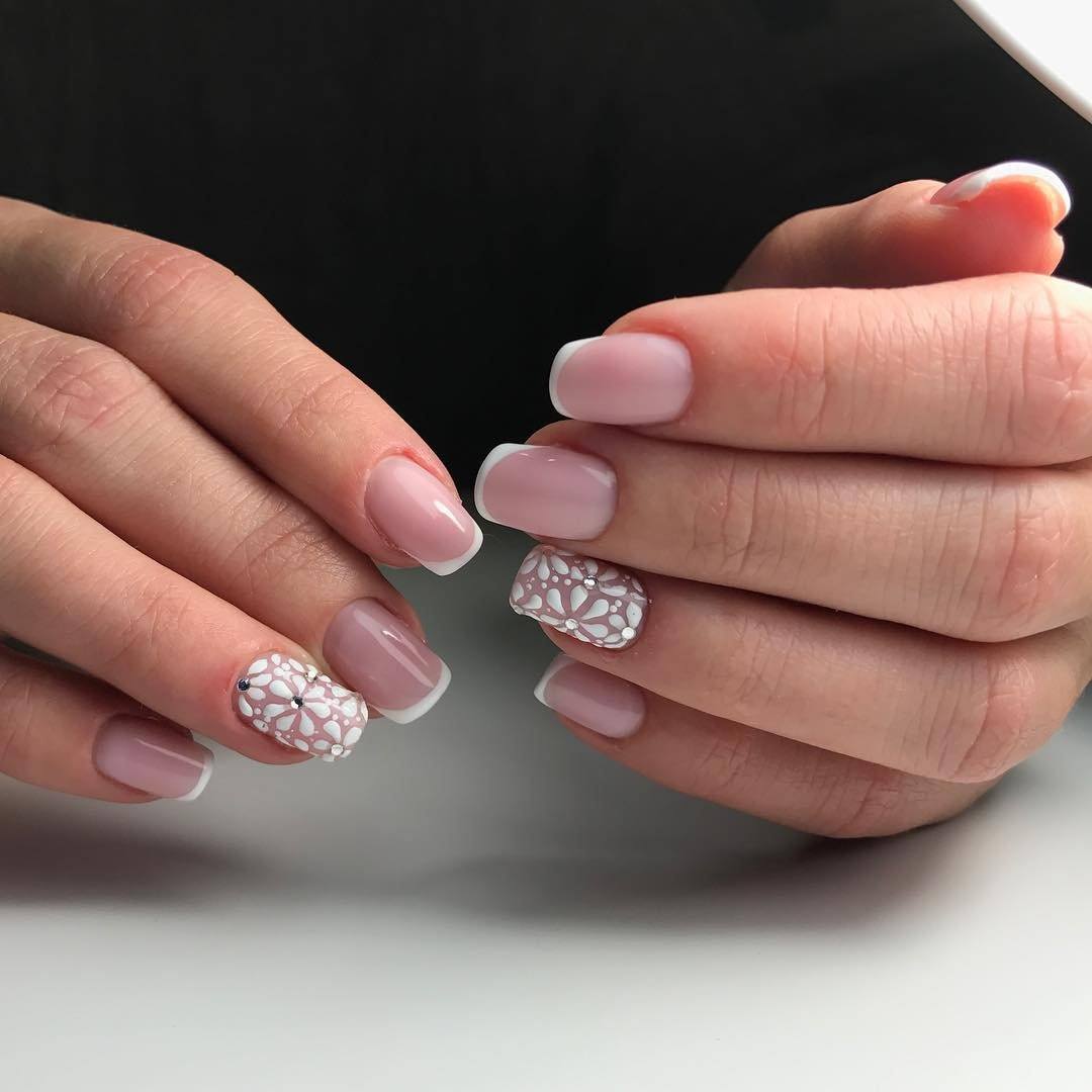 Великолепно смотрится градиентный бело-розовый маникюр, в котором один из ноготков выделен глиттером, мелкими прозрачными бульонками и стразами. Присмотритесь к классическому французскому маникюру, в создании которого как раз участвуют эти оттенки. Блестки при этом можно использовать для выделения края ногтя или отвести под блестящий декор какой-нибудь из ноготков.