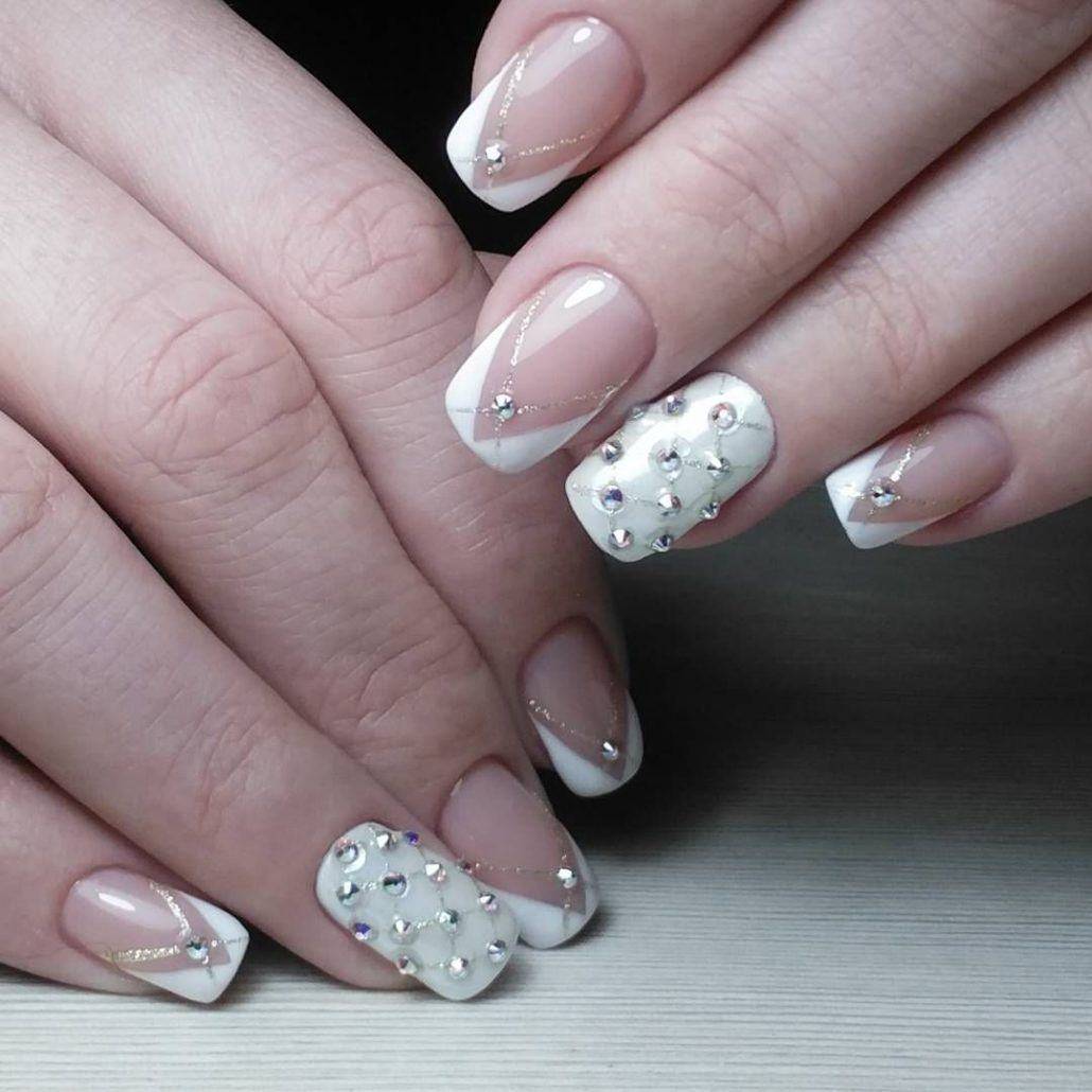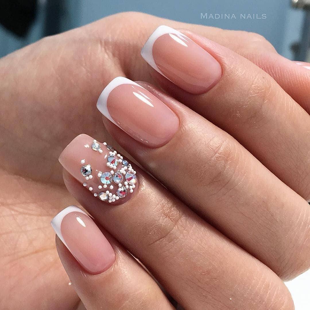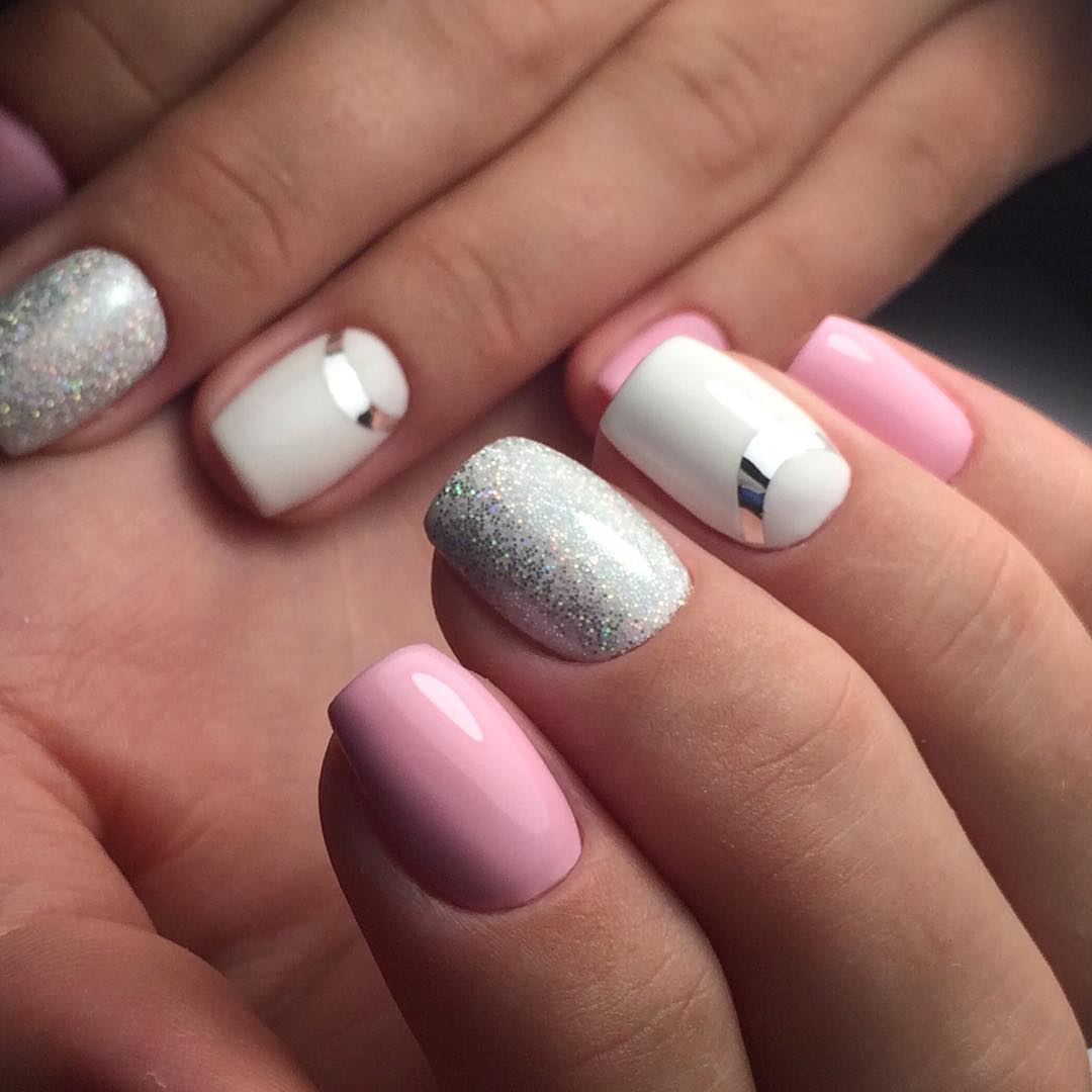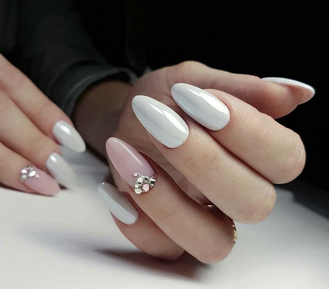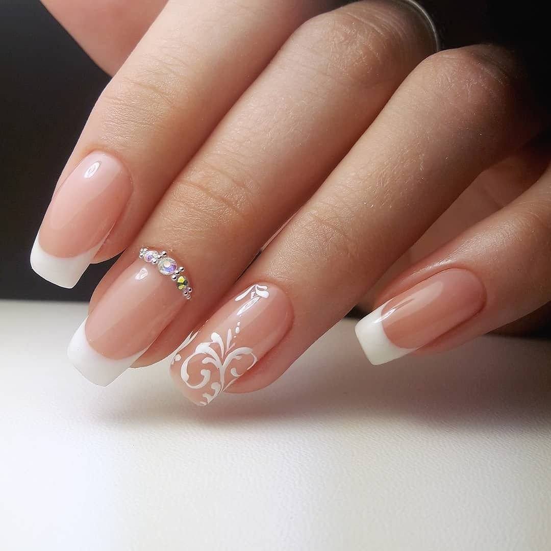 Великолепно смотрится градиентный бело-розовый маникюр, в котором один из ноготков выделен глиттером, мелкими прозрачными бульонками и стразами. Присмотритесь к классическому французскому маникюру, в создании которого как раз участвуют эти оттенки. Блестки при этом можно использовать для выделения края ногтя или отвести под блестящий декор какой-нибудь из ноготков.