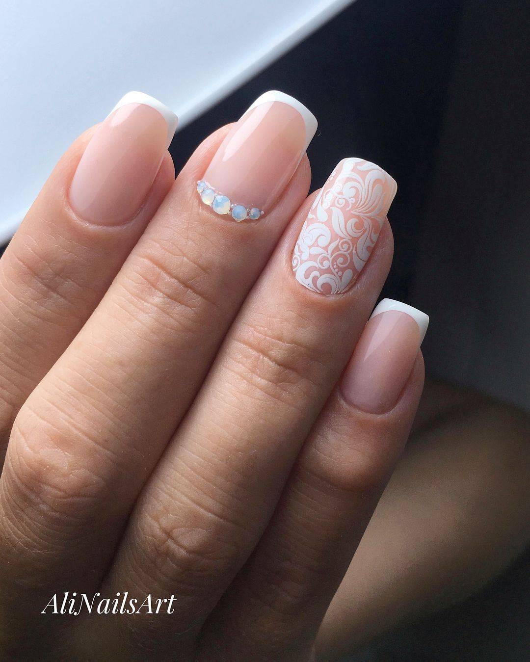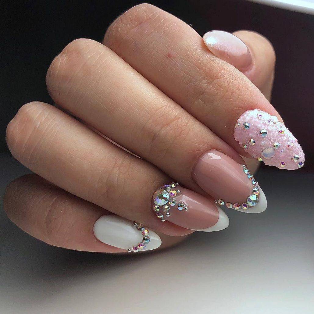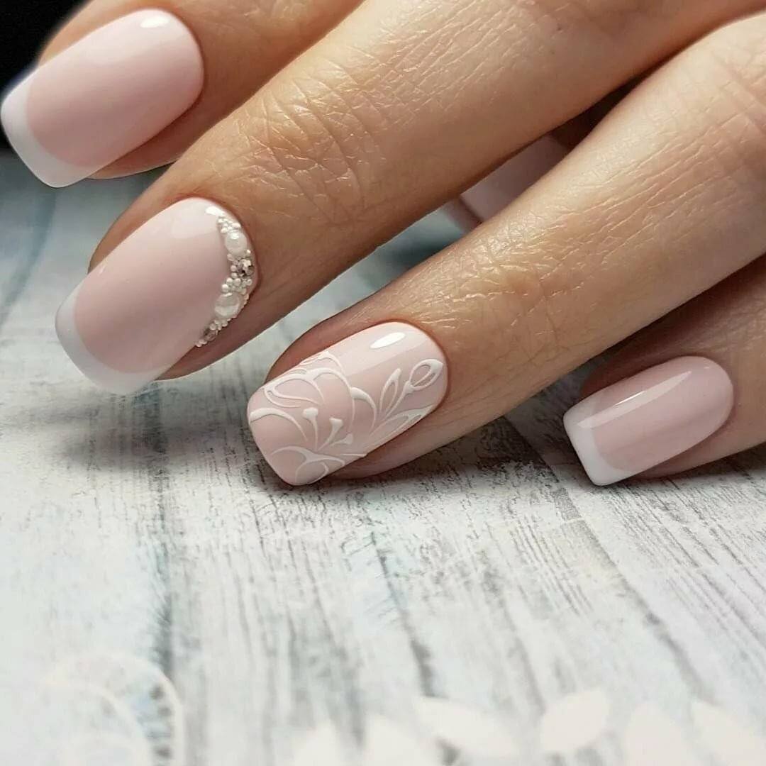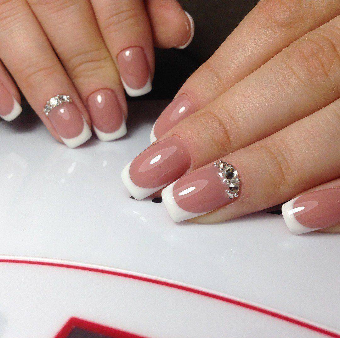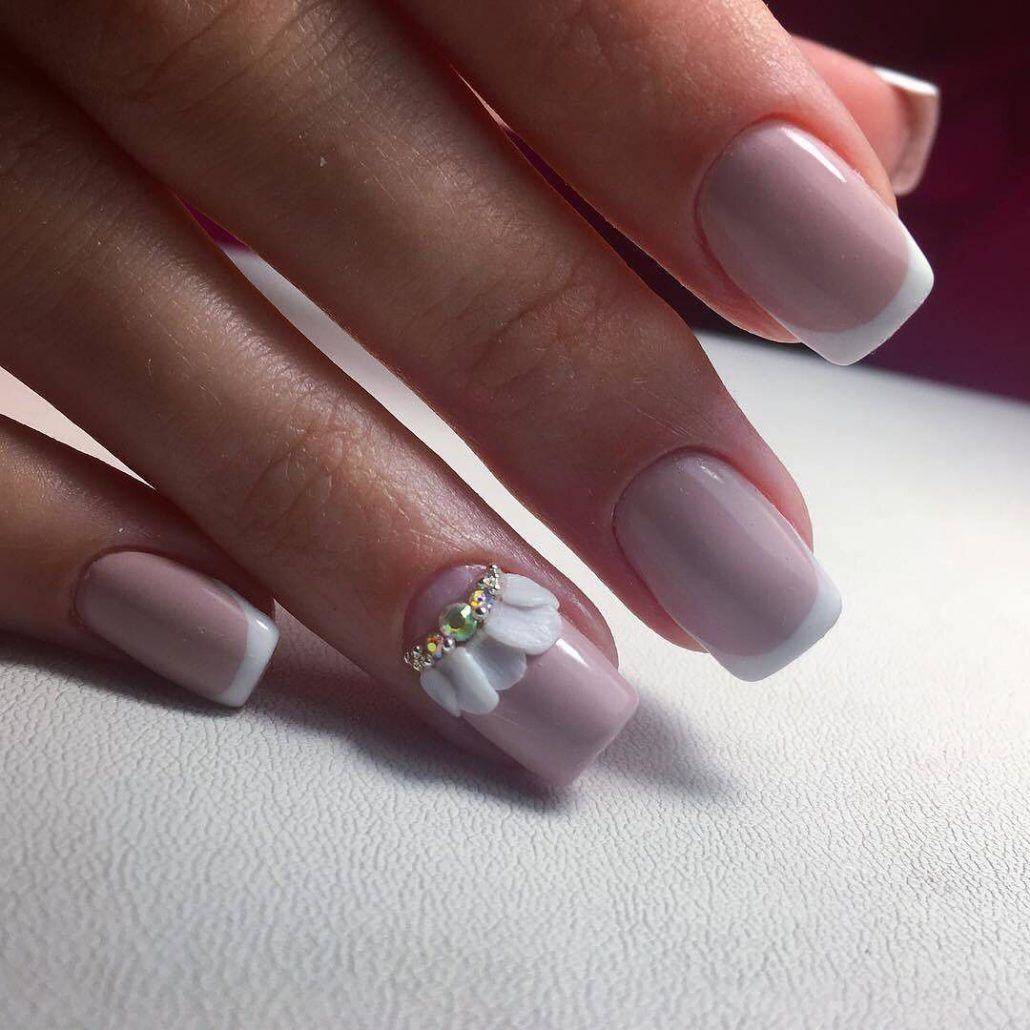 Великолепно смотрится градиентный бело-розовый маникюр, в котором один из ноготков выделен глиттером, мелкими прозрачными бульонками и стразами. Присмотритесь к классическому французскому маникюру, в создании которого как раз участвуют эти оттенки. Блестки при этом можно использовать для выделения края ногтя или отвести под блестящий декор какой-нибудь из ноготков.