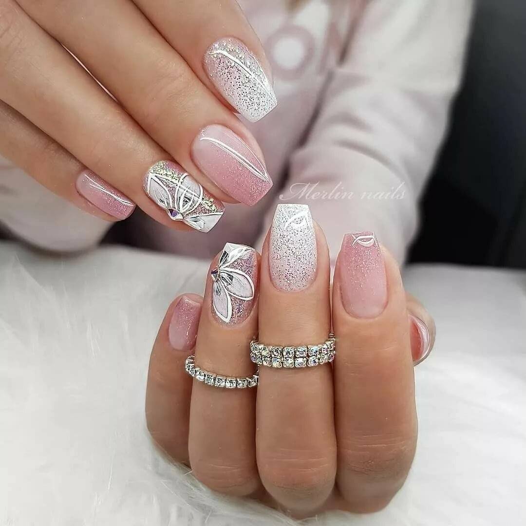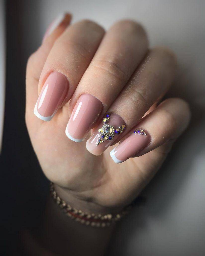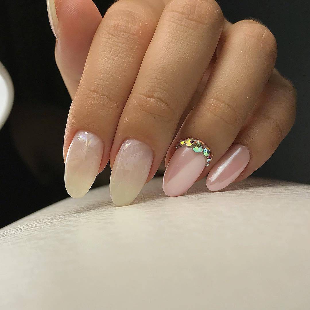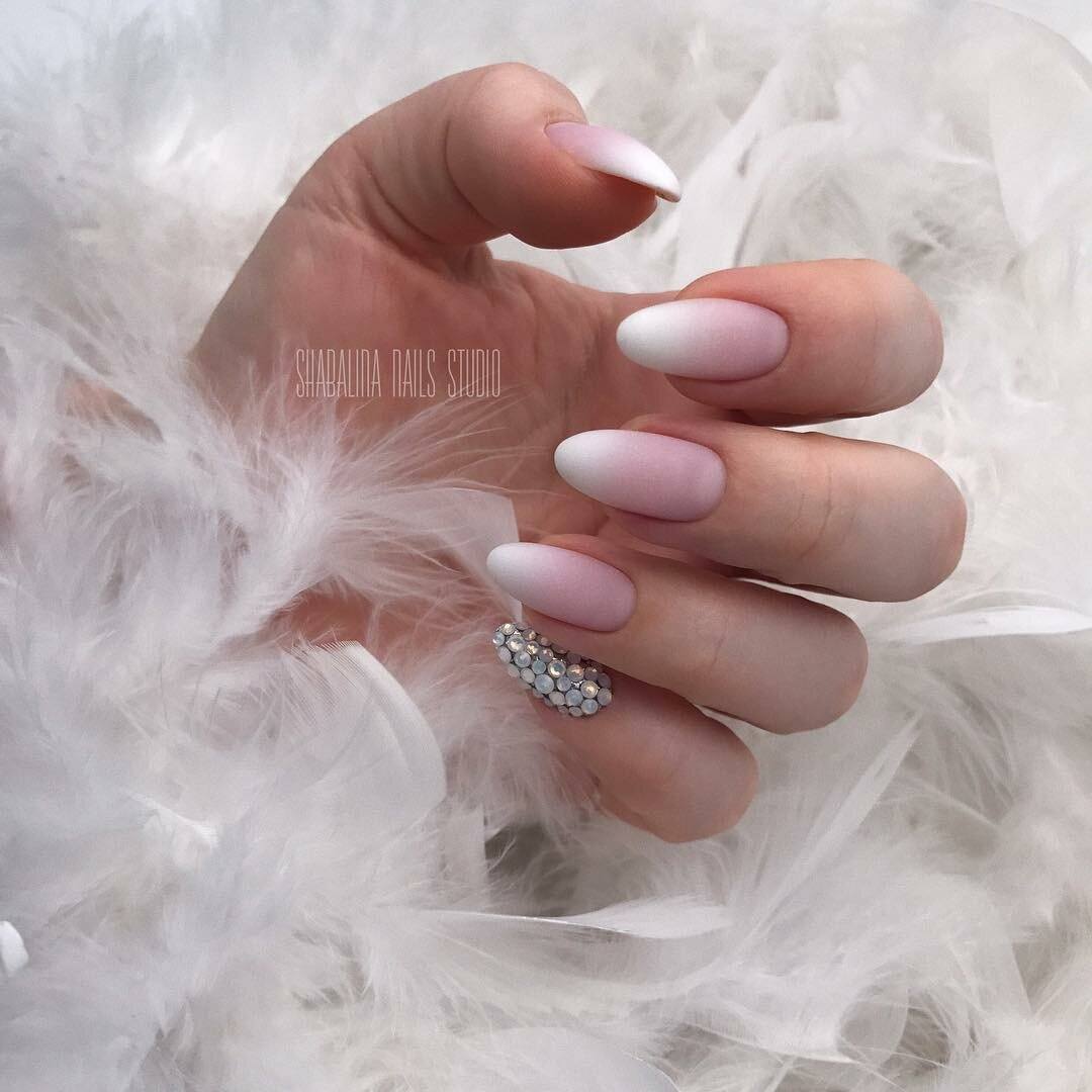 Великолепно смотрится градиентный бело-розовый маникюр, в котором один из ноготков выделен глиттером, мелкими прозрачными бульонками и стразами. Присмотритесь к классическому французскому маникюру, в создании которого как раз участвуют эти оттенки. Блестки при этом можно использовать для выделения края ногтя или отвести под блестящий декор какой-нибудь из ноготков.