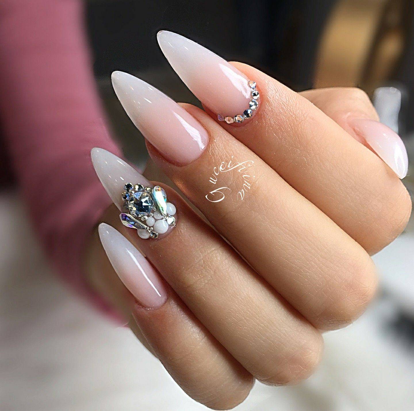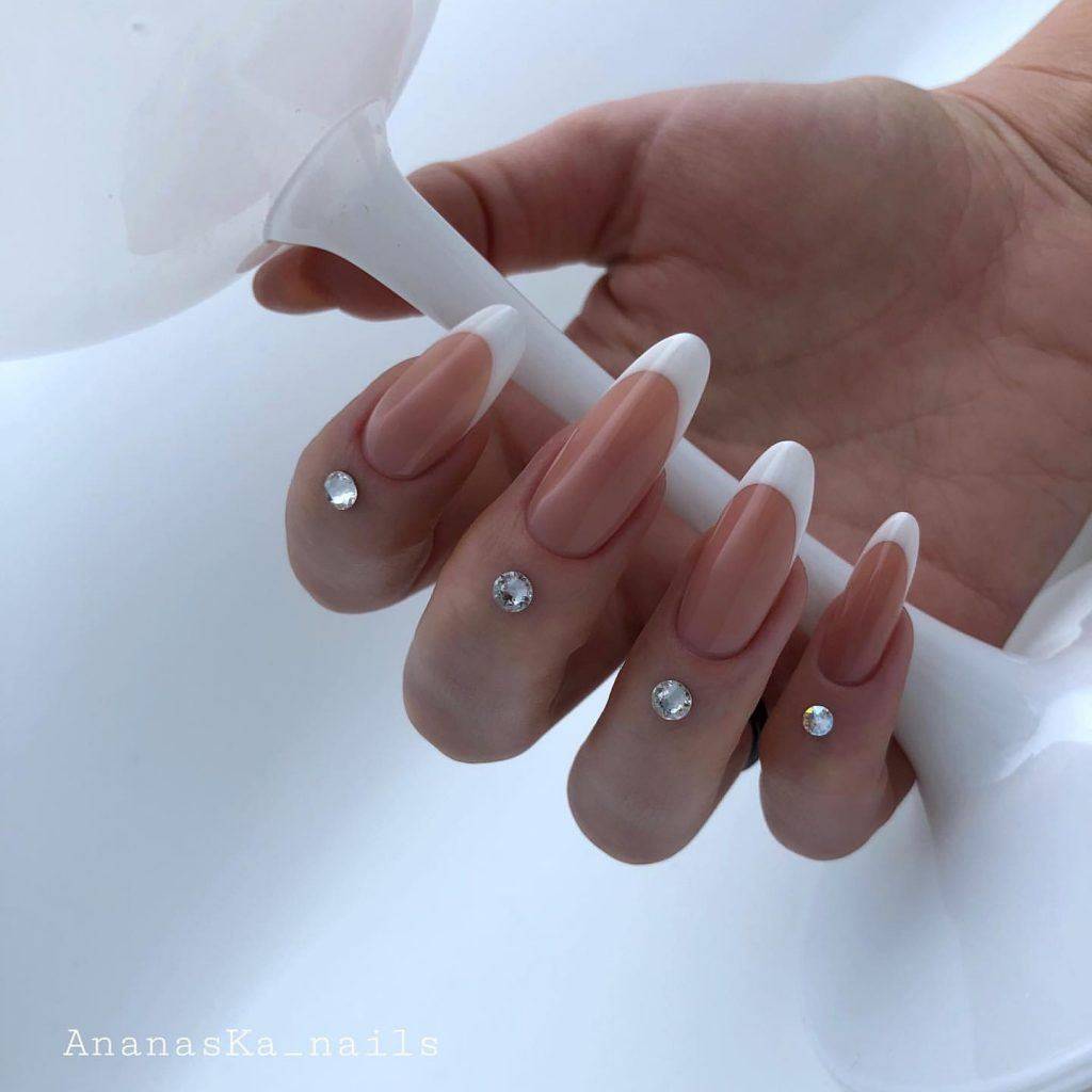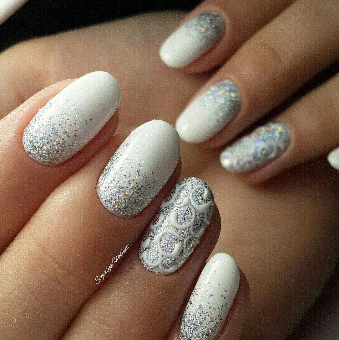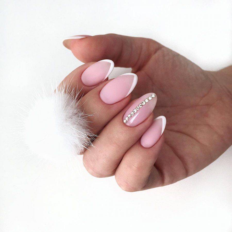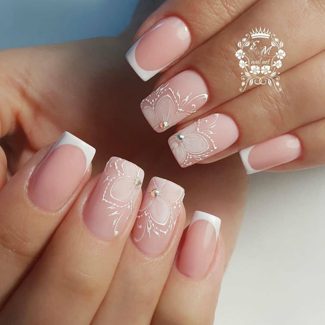 Великолепно смотрится градиентный бело-розовый маникюр, в котором один из ноготков выделен глиттером, мелкими прозрачными бульонками и стразами. Присмотритесь к классическому французскому маникюру, в создании которого как раз участвуют эти оттенки. Блестки при этом можно использовать для выделения края ногтя или отвести под блестящий декор какой-нибудь из ноготков.