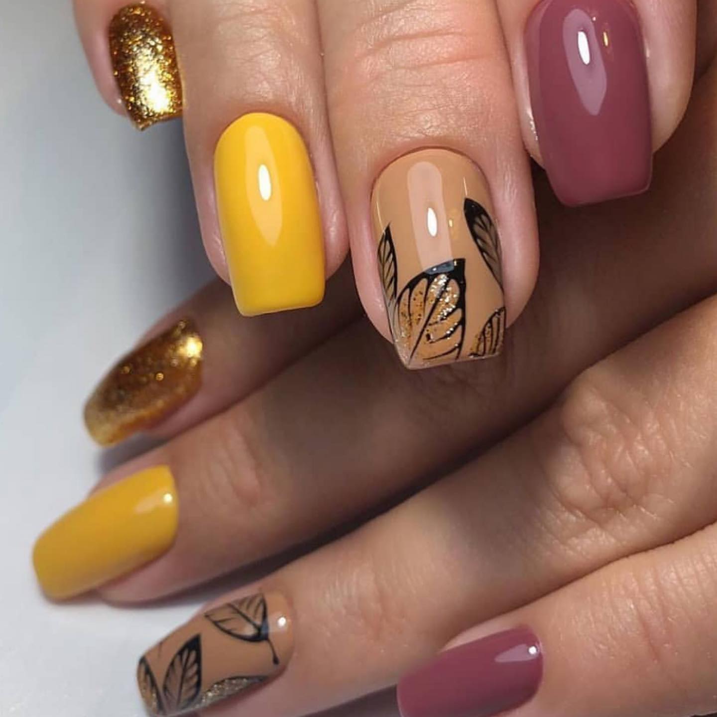 Лиловый маникюр в комбинации с оранжевымЛиловый маникюр в комбинации с желтым цветом