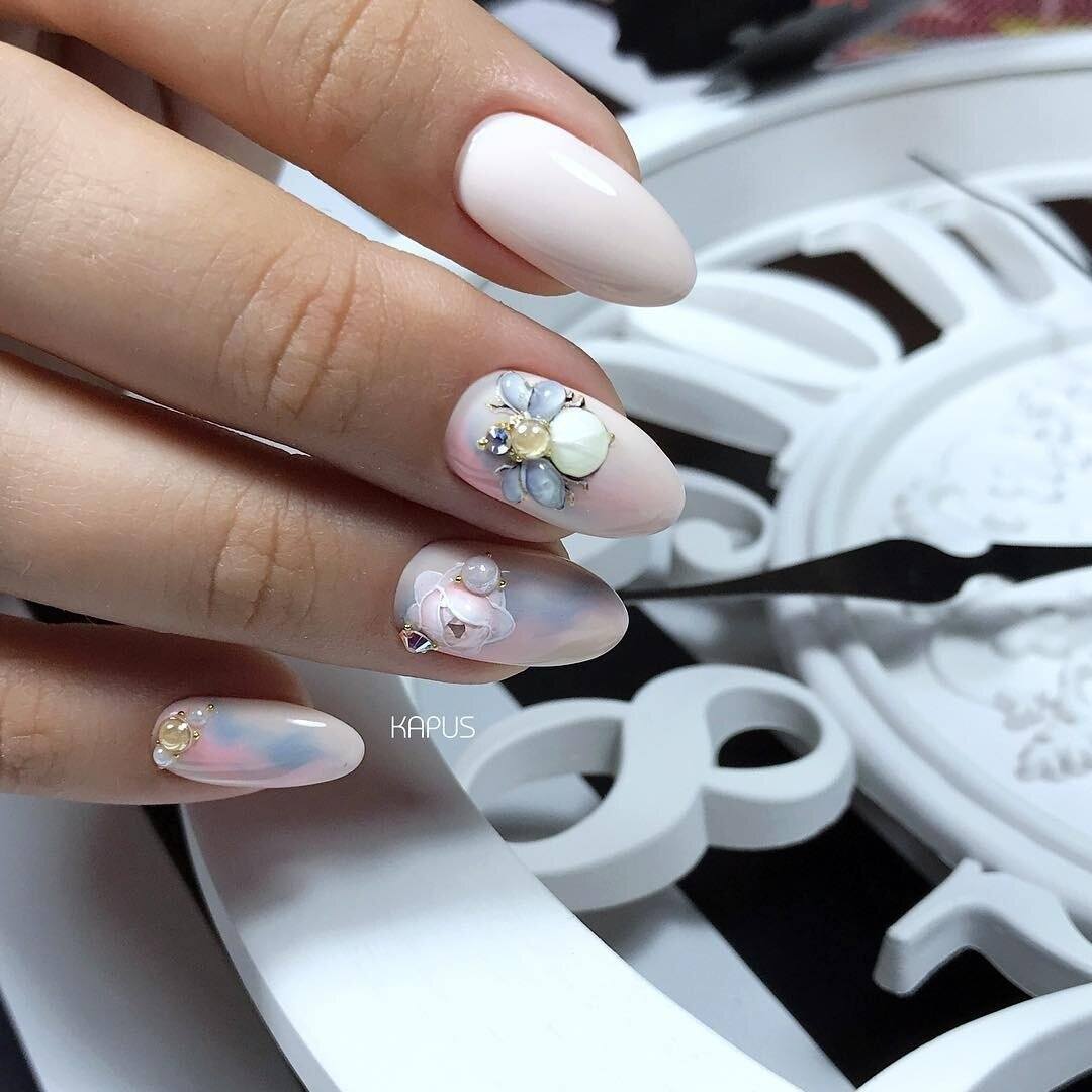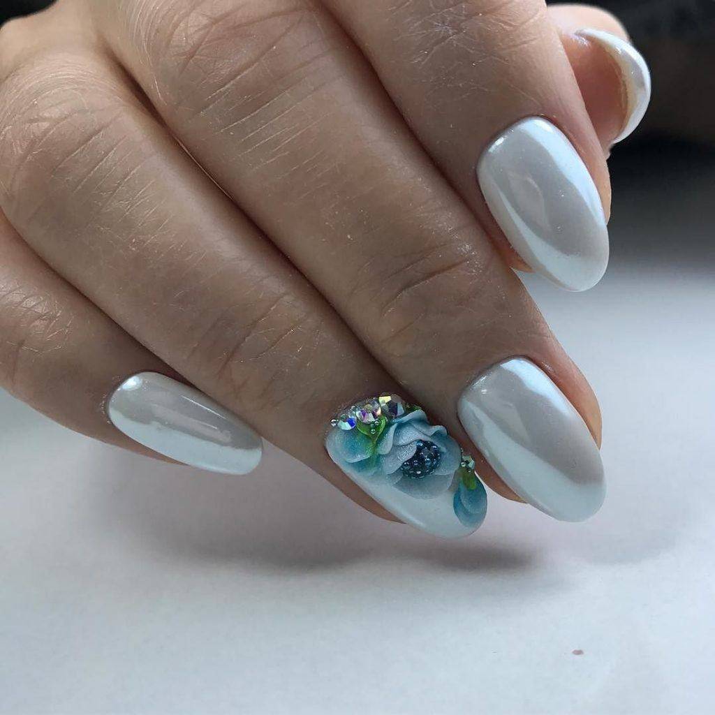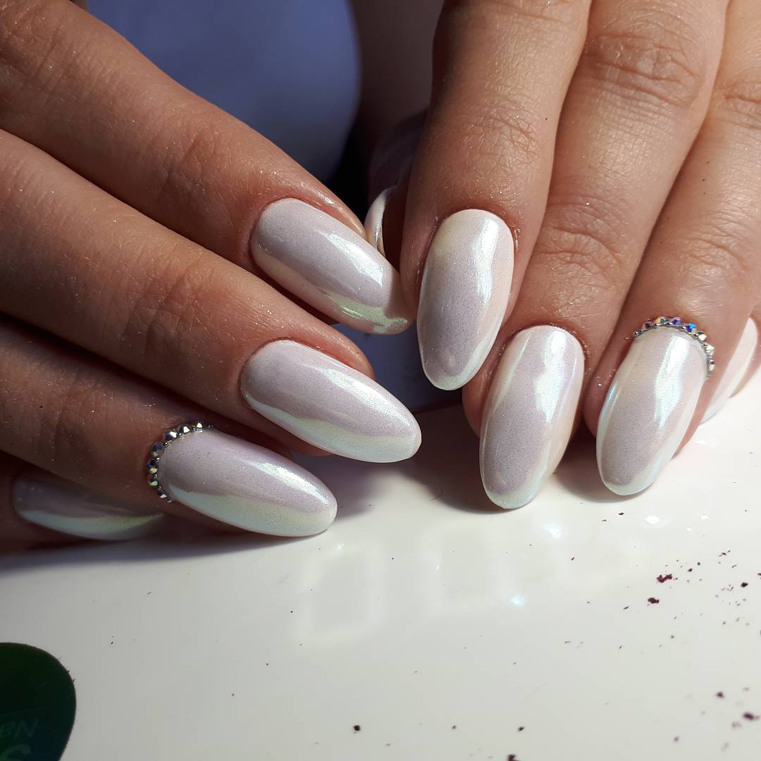 жемчужная – выглядит очень нежно, ноготки словно окутаны тонкой легкой вуалью, цвет основного покрытия практически не изменяется, декор не имеет ярко-выраженного блеска, выглядит спокойно и подойдет для повседневной носки;