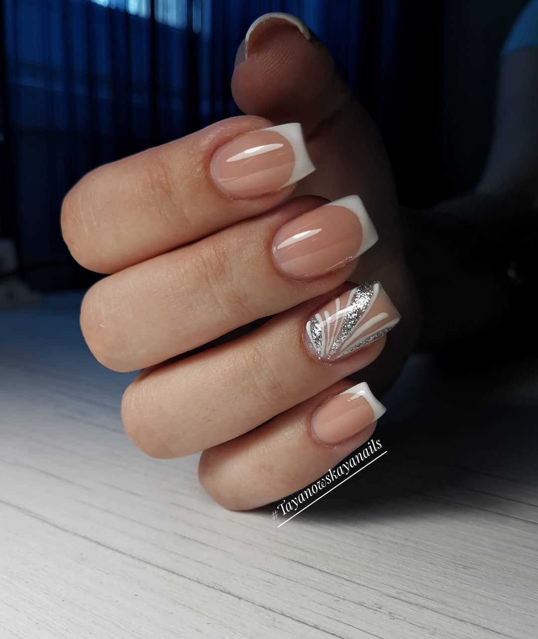 Стандартные белый, серый, бежевый, персиковый или бледно-розовый оттенки лака в этом случае смотрятся с блестящим пигментом просто потрясающе. Если подобной идеи вам кажется недостаточно и остаётся ощущение, что в маникюре чего-то не хватает, можно украсить маникюр рисунком или создать комбинированный дизайн, в котором френч сочетается с однотонными ногтями, покрытыми голографическими переливами или металлическим сиянием.