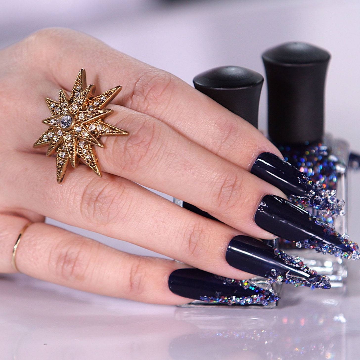 Что касается длинных ноготков, то в этом случае позволены небольшие эксперименты. В качестве примера можно выполнить дизайн с более объёмными изображениями на паре ноготков, ведь площадь ногтевой пластины к этому только располагает. Такое «полотно» можно украсить объёмными рисунками из акриловой пудры или сказочными картинами с ажурными элементами, имитирующими морозные узоры. Очень эффектно будут отражаться в огоньках гирлянд россыпи мелких кристаллов с огранкой под драгоценные камни, снежинки, пушистые ветви ели с игрушками, снеговики или крохотные часы. Фантазия в этом случае не знает границ.