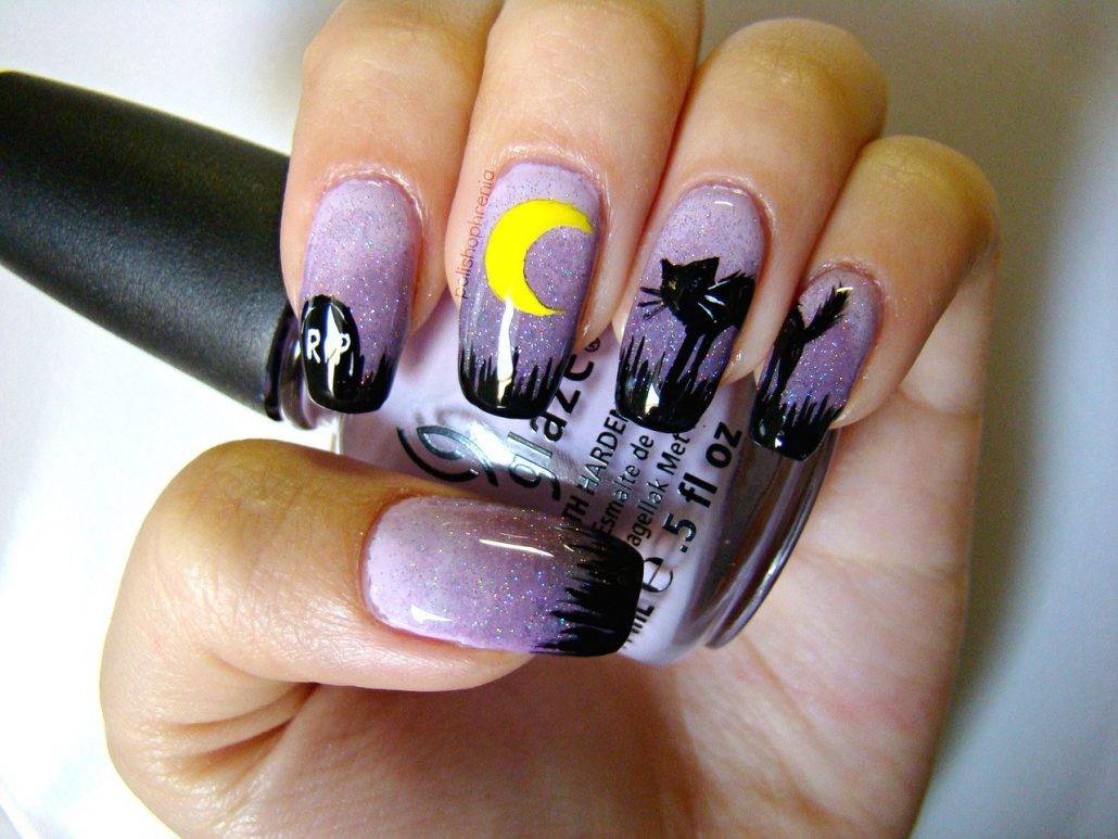 Отлично украсят ваш маникюр декоры ведьминских аксессуаров. На ногтях рисуют колпаки, сов метлу и всё что душа пожелает. Неизменным спутником любой злодейки, является чёрная кошка. Изображения этого животного, кошачьи глаза и следы кошачьих лапок очень популярны для Хэллоуина. Можно создать на ногтях целую история, смысл которой вы увидите при более внимательном рассмотрении. Базовый фон выбирайте ярче и светлее. А вот рисунки с кошачьей тематику выполните в чёрном цвете. Дизайн получится не только устрашающим, но милым и грациозным. Можно добавить любой декор: фольгу, стразы и блёстки.