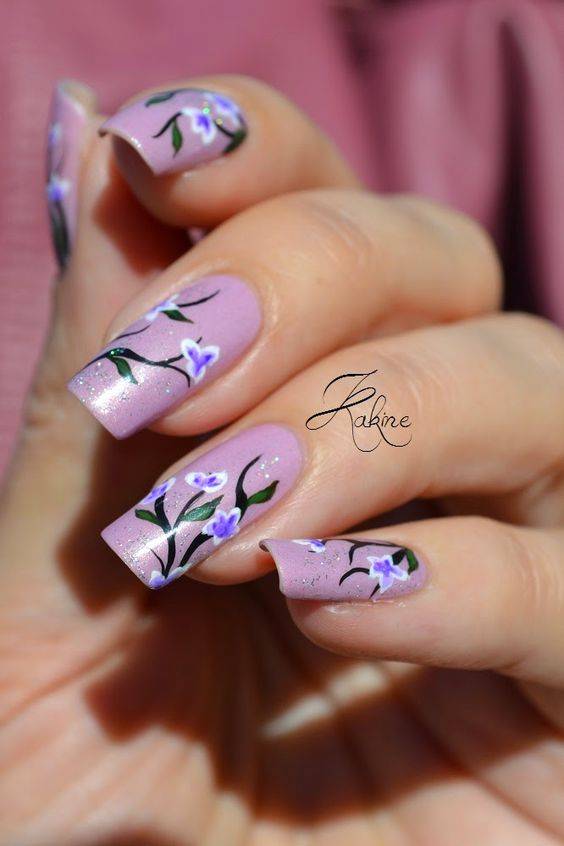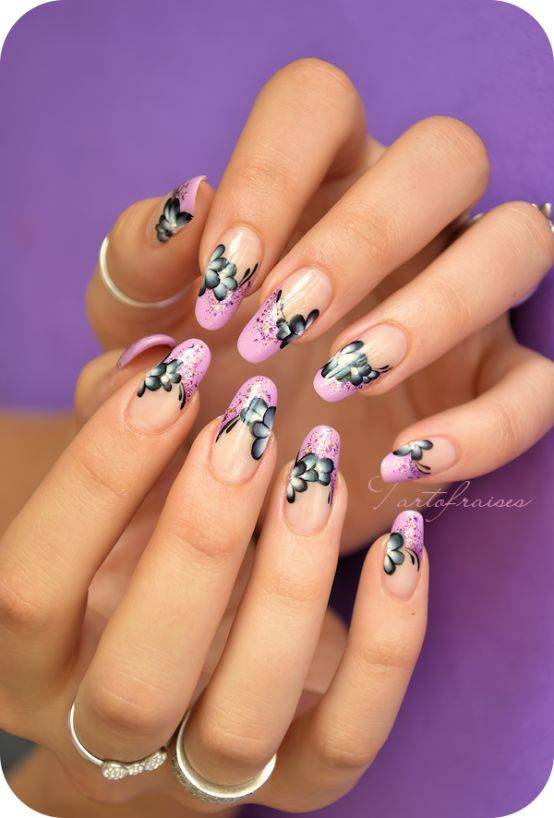 Невероятно красивый французский маникюр в нежно розовом оттенке дополнен дополнительным декором в виде цветов контрастного цвета.