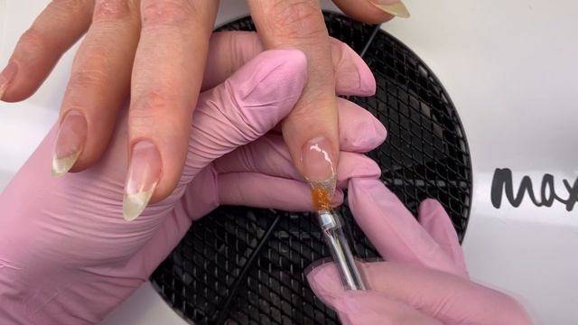 Окуните кисточку в акриловую жидкость и аккуратно нанесите ее на ногтевую пластину, избегая попадания на кутикулу