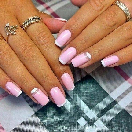 Довольно необычное исполнение французского маникюра за счет правильно расположенных линий.