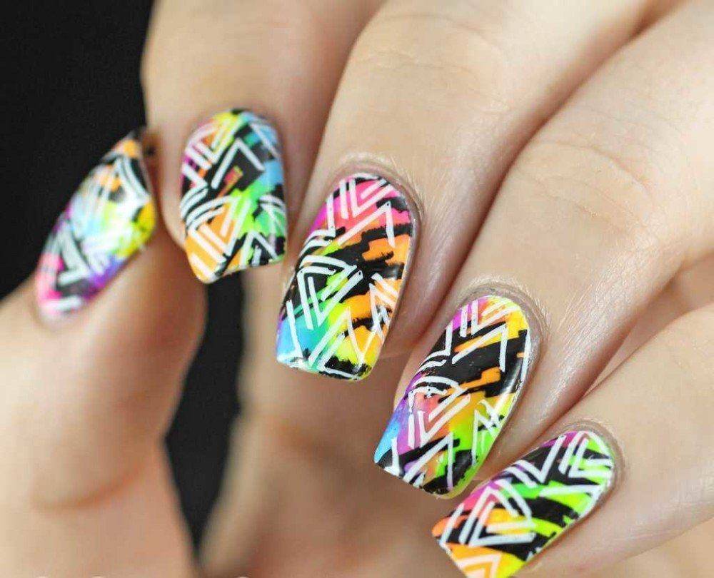 Разводы отлично смотрятся в дизайне с геометрией. Для этого выполняйте окантовку узора с разводами прямыми тонкими линиями, треугольниками. Выполняйте узор с разводами внутри ромбов и треугольников. В качестве цвета для окантовки можно использовать черный или белый гель-лак.