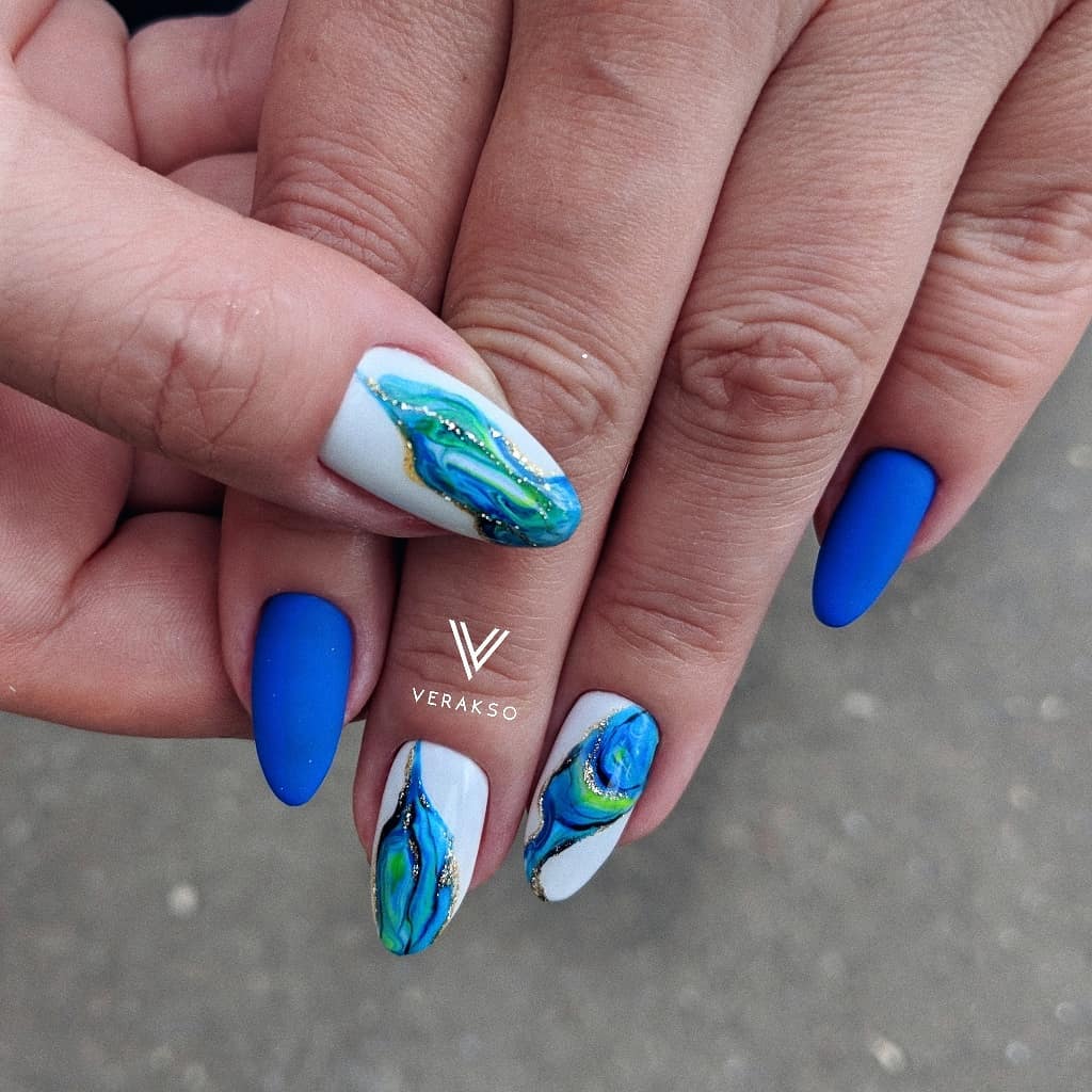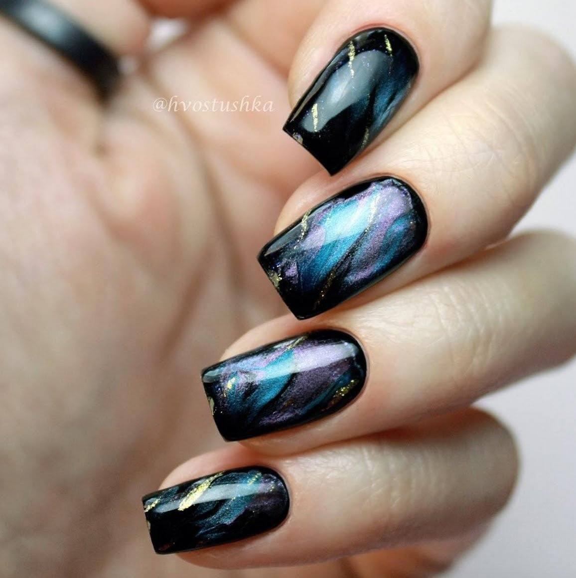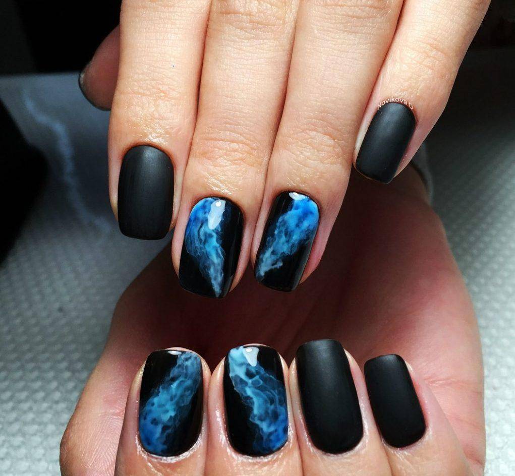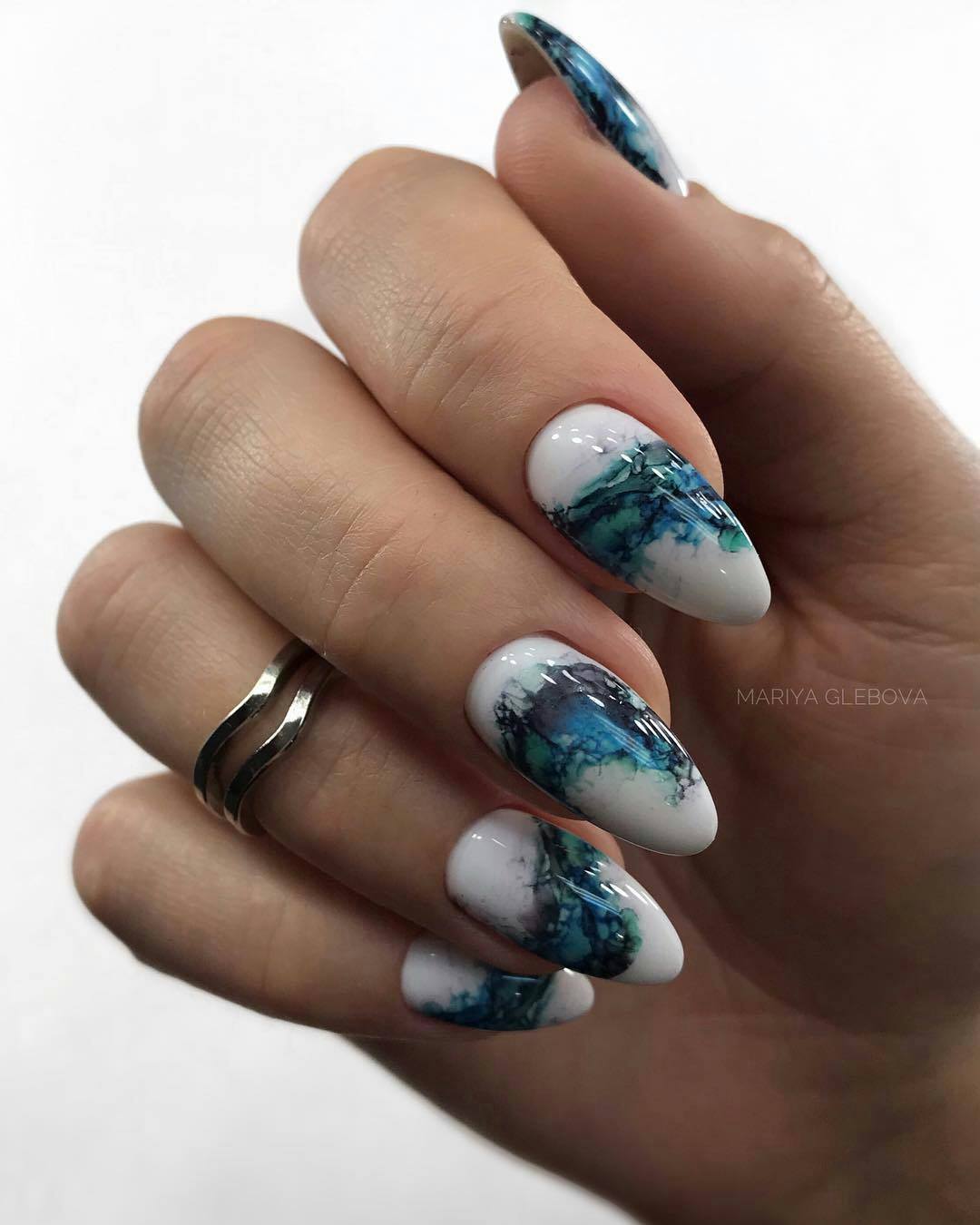 Новинки в мраморном дизайне – это яркие ногти, чаще зеленые, изумрудные, темно- синие и даже черные.