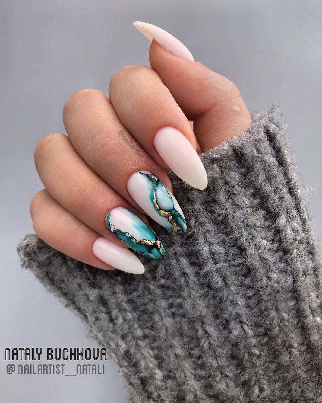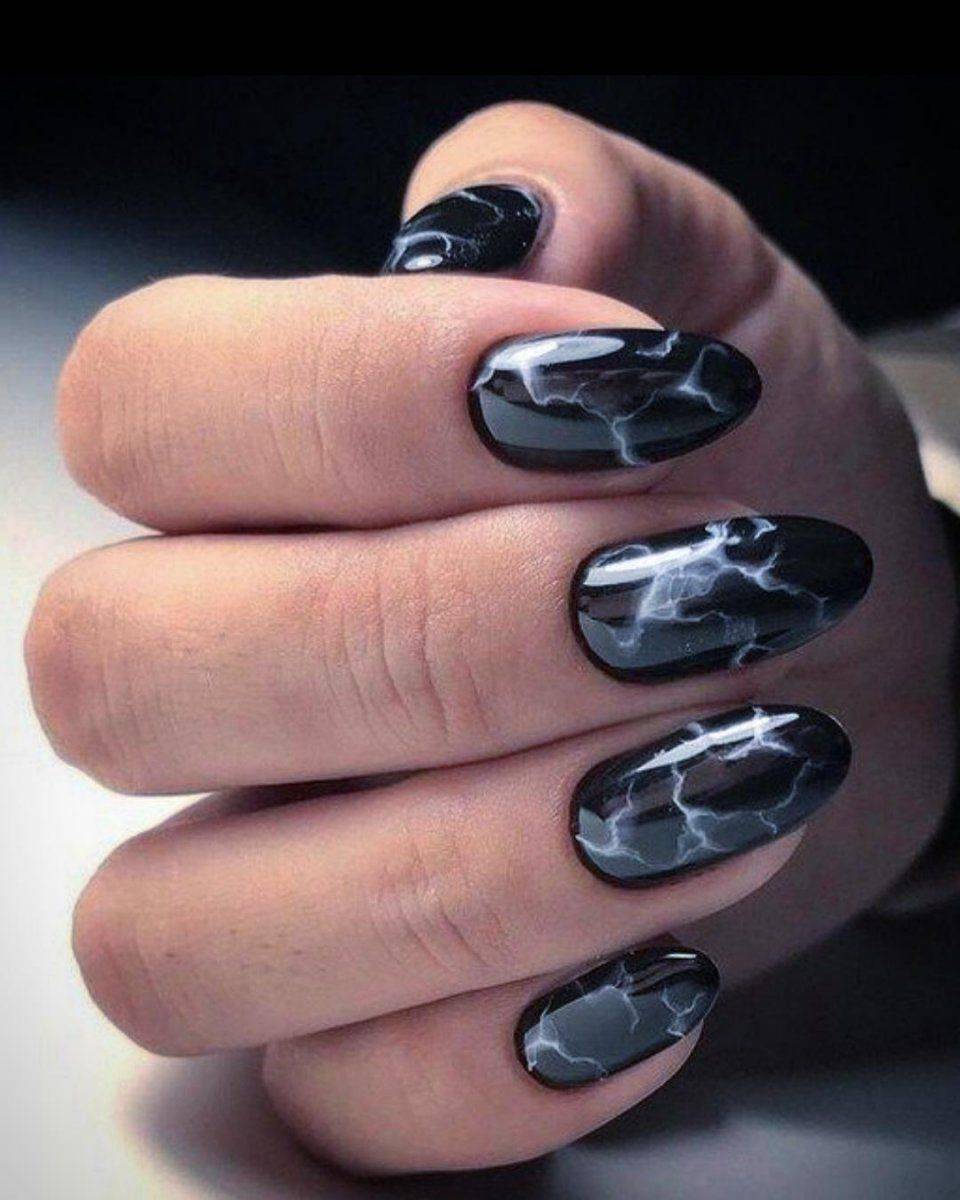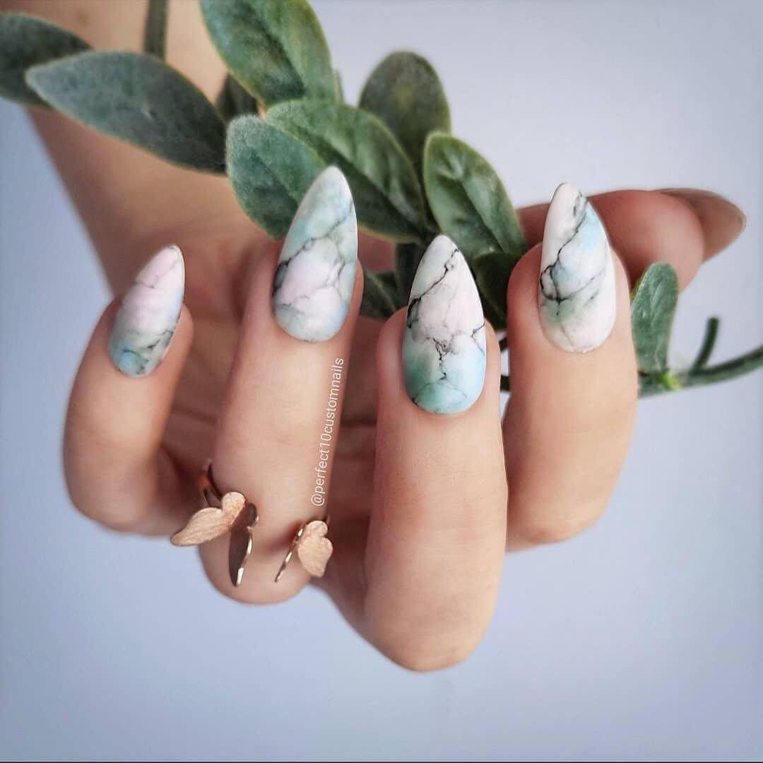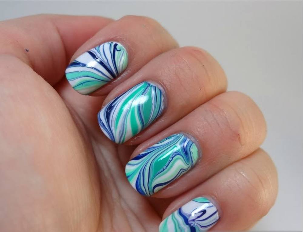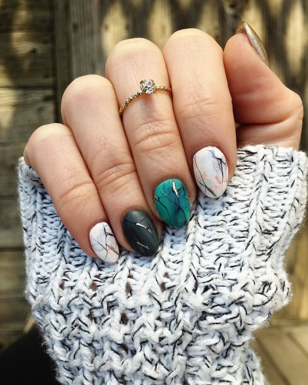 Новинки в мраморном дизайне – это яркие ногти, чаще зеленые, изумрудные, темно- синие и даже черные.