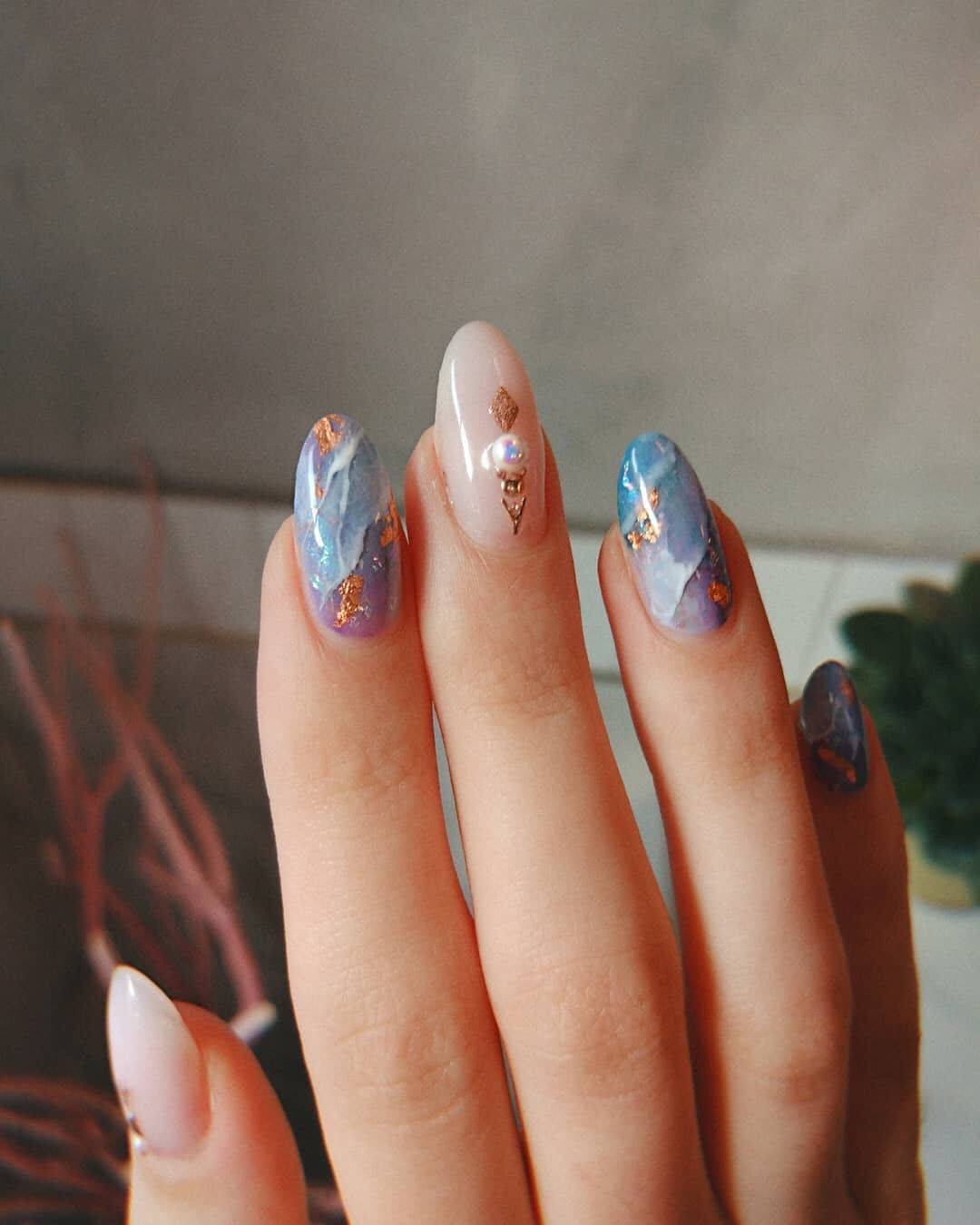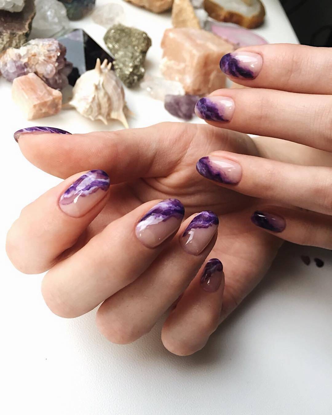 Мрамор на ногтях гель-лаком делает их поверхность похожей на натуральный камень. С помощью средств разных оттенков имитируют также внешний вид бирюзы, малахита, опала, кварца и т. п., это зависит от используемых цветов.