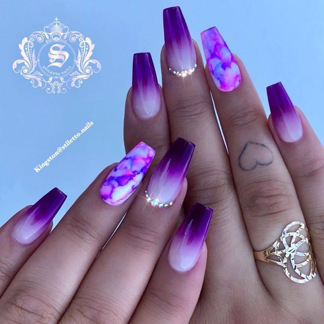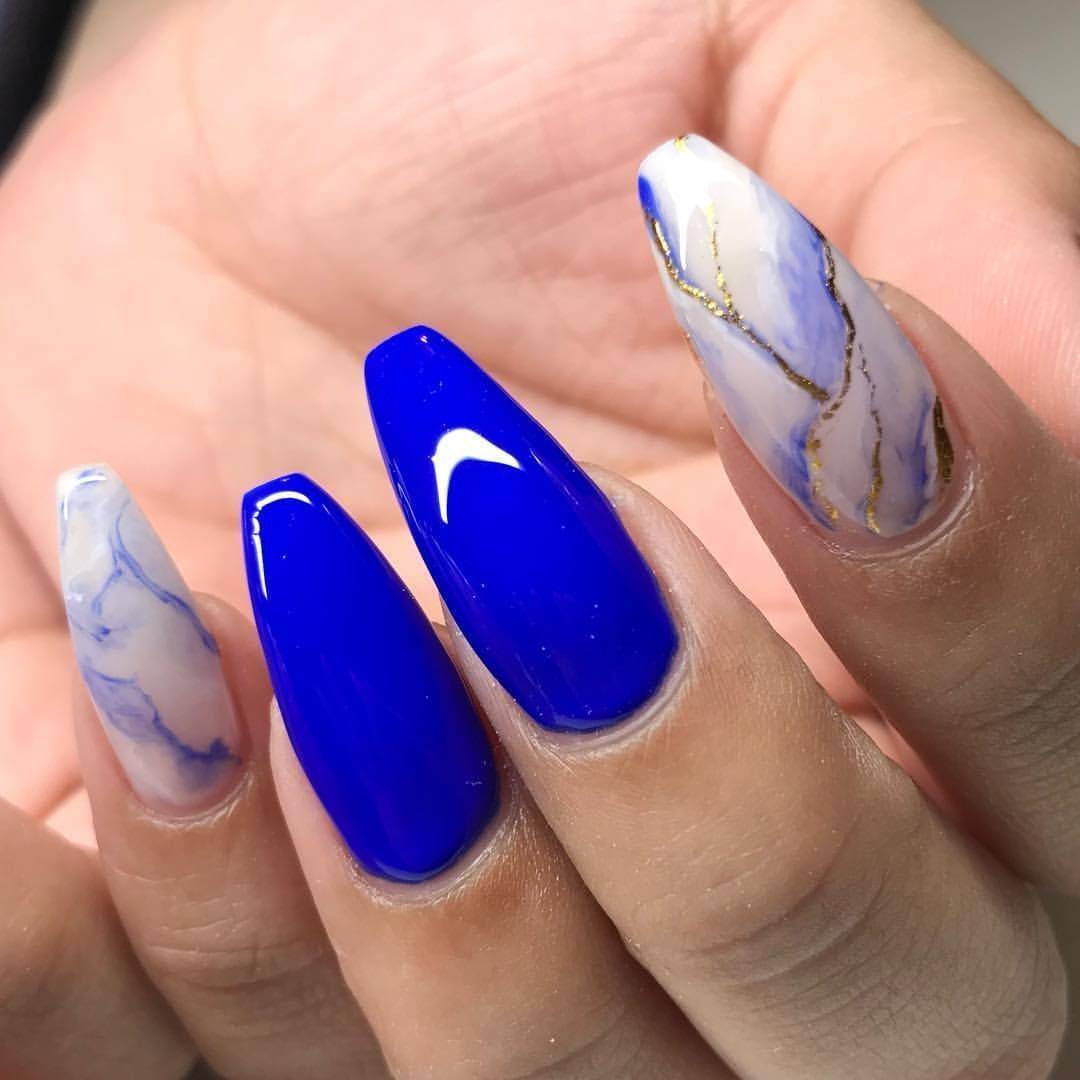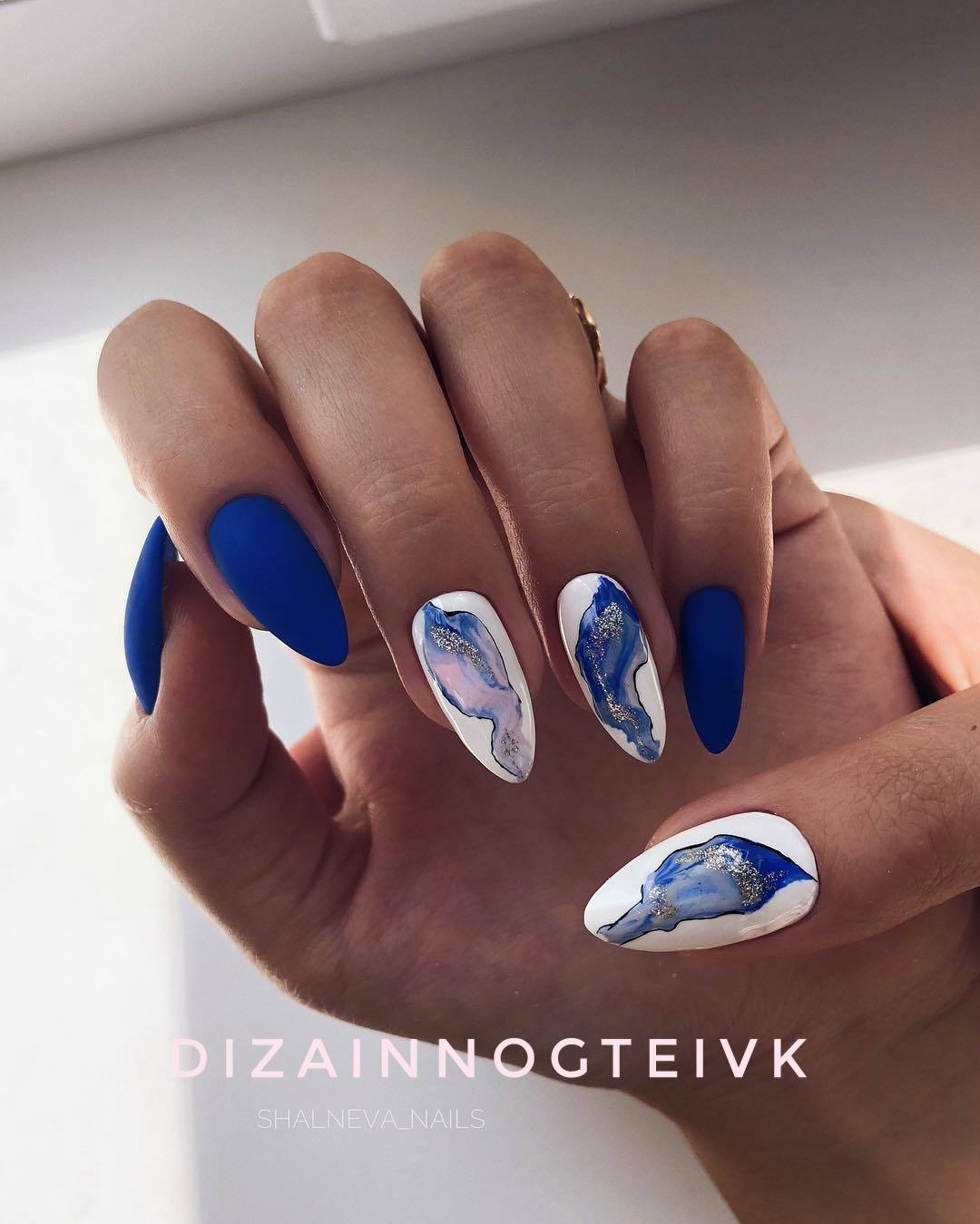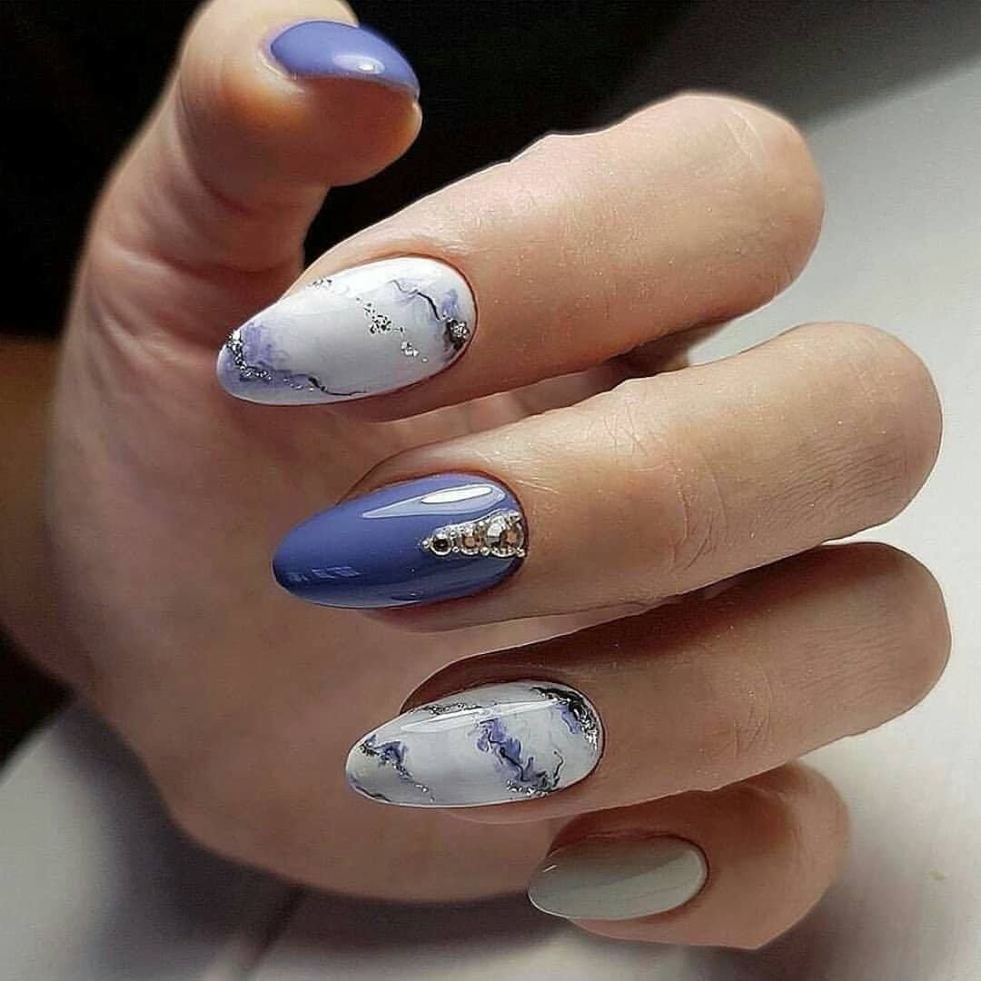 – указательный и средний или средний и безымянный. Для ярких женщин подойдут темные основные оттенки и светлые контрастные разводы. Необычно смотрится синий и белый с вкраплениями золота, ровно как и насыщенный зеленый, фиолетовый, желтый, черный, голубой.