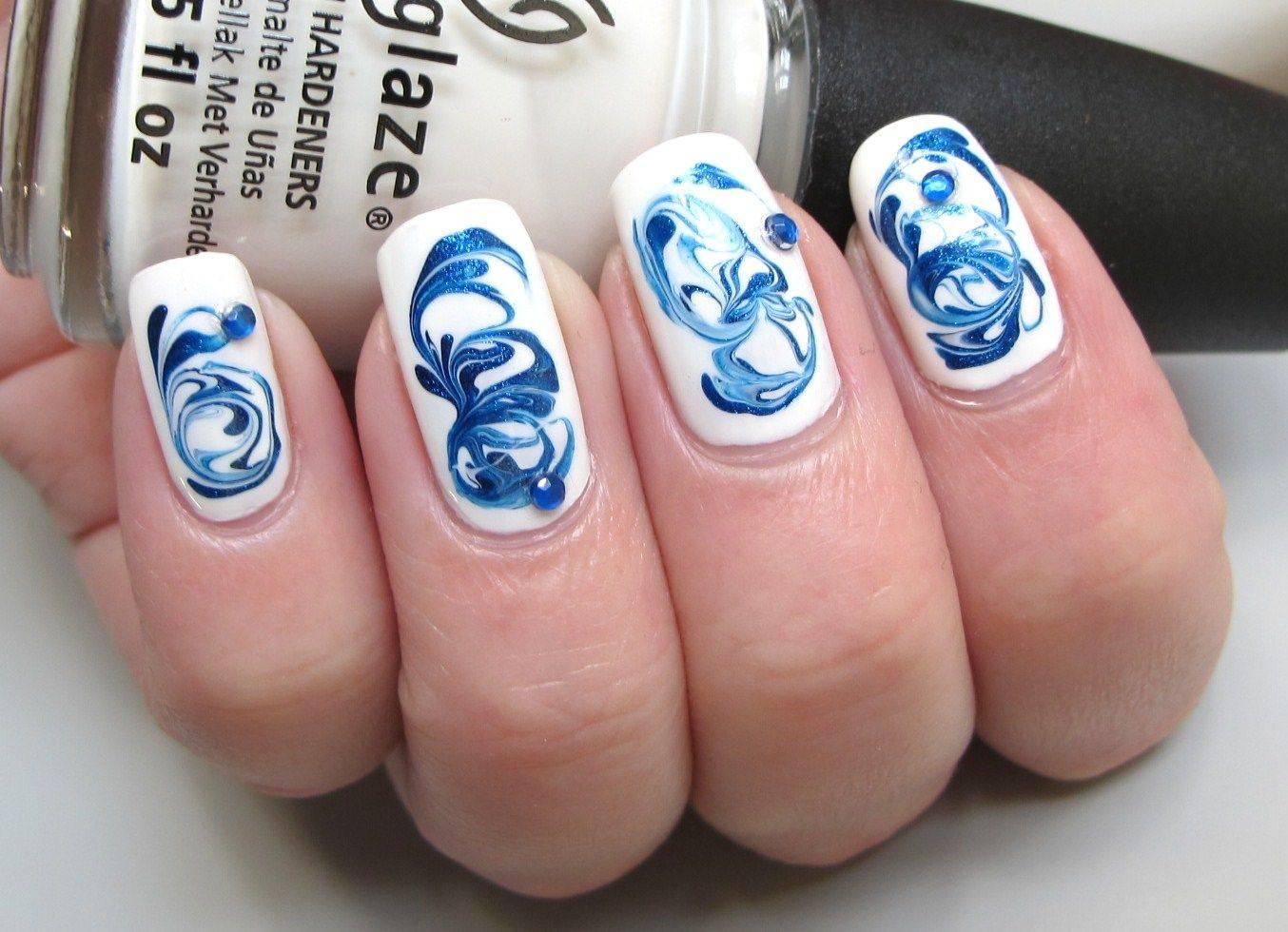 Еще один вариант дизайна с разводами – это стразы. Они никогда не будут лишними, особенно в сочетании с нежными витиеватыми узорами. Располагайте стразы в прикорневой зоне, выделяйте ими границы узора, выполняйте инкрустацию на безымянном пальце или мизинце.