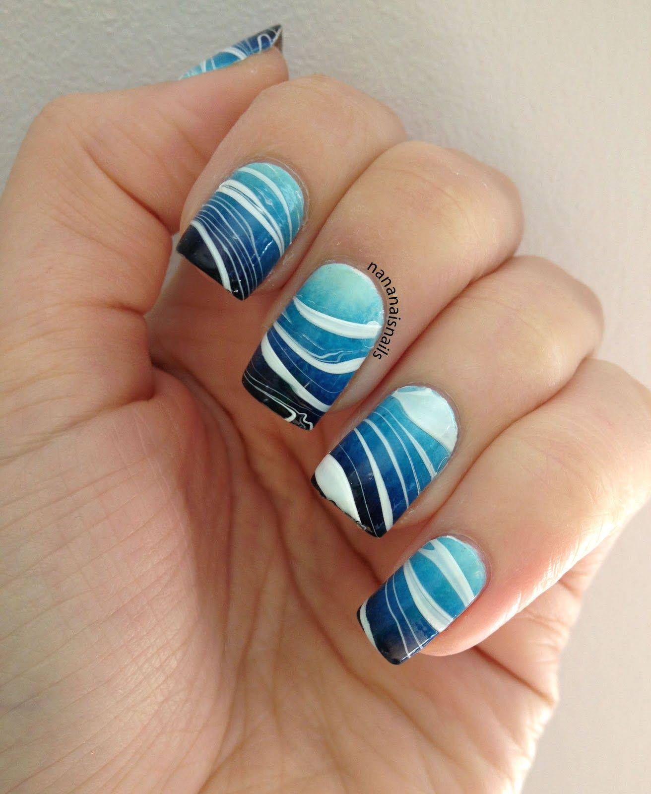 Главным элементом росписи будет смещенная или диагональная волна. Нарисовать ее – самая трудная из предстоящих задач. Когда все волны-разводы на ногтях готовы, нужно нарисовать симпатичные капельки над и под каждым изгибом.