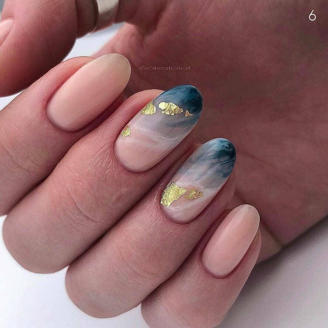 Маникюр в стиле «нюд» перестанет быть скучным, если разнообразить его мраморным настроением и нанести контрастные разводы на пару ноготков