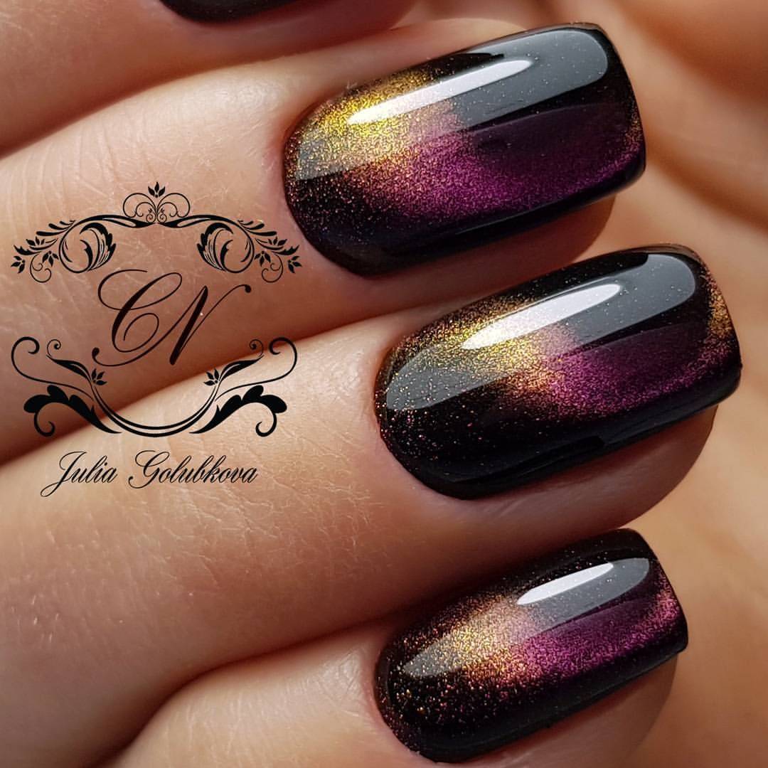 Важно! Для стемпинга на гель-лаке кошачий глаз, чтобы сделать такие красивые переходы из черного в рассеянный блик, нужно использовать именно черный цвет краски