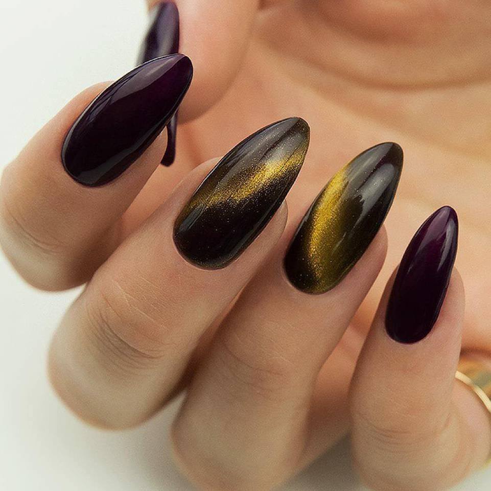 - После этого я нанесла гель-лак кошачий глаз с двойным бликом, промагнитила его со всех сторон для получения рассеянного блика под разным углом и высушила.