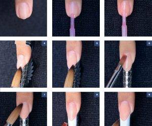 - при работе с гелем каждый слой аккуратно подгибается для того, чтобы добиться нужной формы. Это самая сложная часть процедуры, для которой потребуются специальные приспособления. Если используется акрил, свободные края подгибаются именно в тот момент, когда материал начнет полимеризоваться;