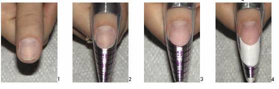 После всех этих предварительных работ под выступающие края плотно подставляются бумажные формы (как уже было сказано выше, необходимо немного направлять их при этом вверх) . Затем самый ответственный момент — создание формы будущего искусственного ногтя.