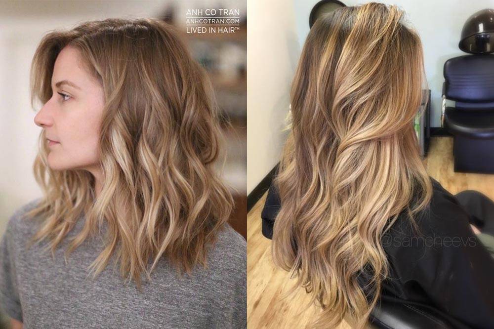 Нижняя светлая часть волос может быть затонирована в золотые, янтарные, пшеничные или соломенные оттенки. Верхушка должна быть довольно темной: здесь будут уместны коньячные, коричневые, каштановые цвета. На темно-русых волосах достаточно соблюдать гармонию естественного цвета у корней: цветовая палитра будет подбираться с учетом натурального цвета прядей, допускается порядка 5-6 различных оттенков (от темного к светлому). На светло-русых волосах мастер может поэкспериментировать с цветом прикорневой зоны, затемнив на несколько оттенков данный участок. Это позволит разнообразить цветовую палитру и сделать натуральный не очень яркий цвет волос, более живым, многогранным и динамичным.
