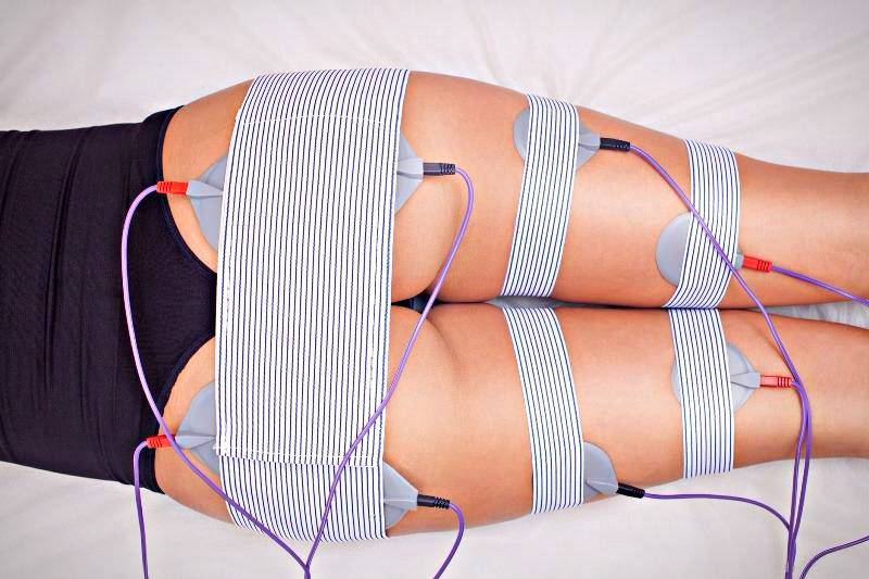 В кабинете вам придется раздеться до нижнего белья и лечь на кушетку. После этого специалист располагает электроды на нужных участках тела, закрепляя специальными ремнями, как на фото. В качестве токопроводящей субстанции может использоваться обычная теплая вода, или специальный гель. В некоторых салонах применяют электроды одноразового действия, напоминающие обычный лейкопластырь. В этом случае, кожу необходимо тщательно очистить от потожировых выделений и влаги.