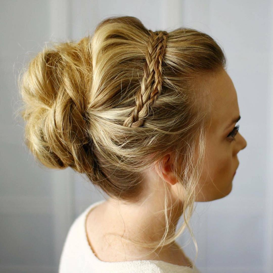 Очень стильные укладки получаются в результате комбинации плетения (различные виды кос) и пучка.