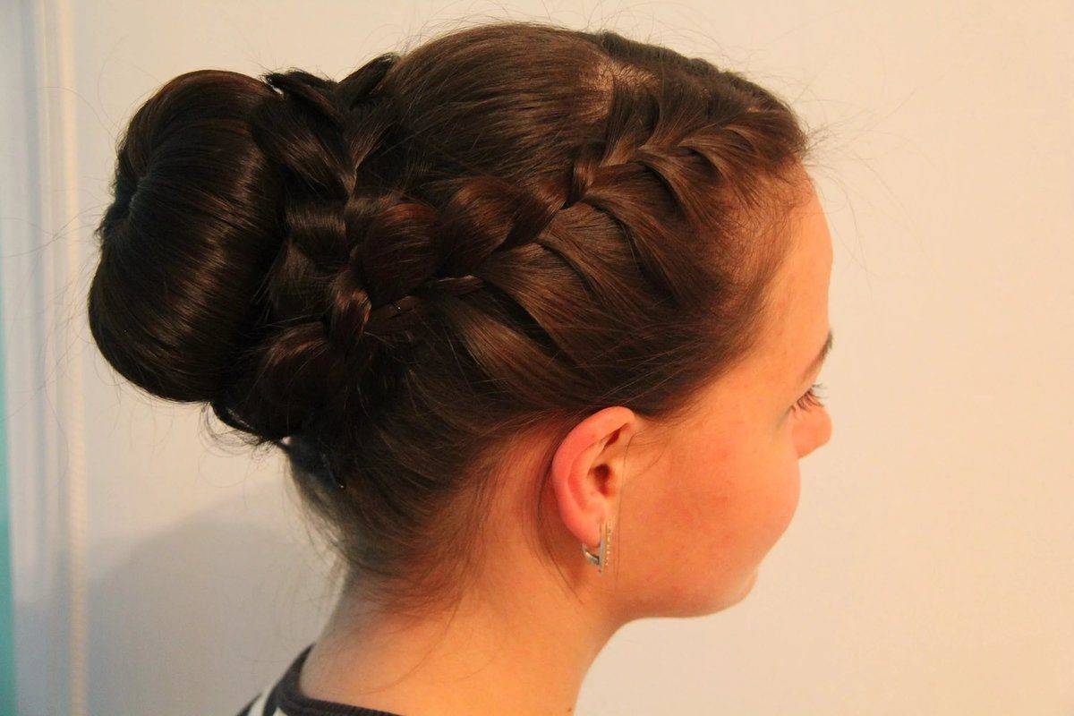 Вначале необходимо сделать боковое плетение и внизу зафиксировать его резинкой. Оставшиеся волосы соберите в классический пучок. Оберните косу вокруг пучка и закрепите невидимкой. Такая прическа смотрится очень красиво.