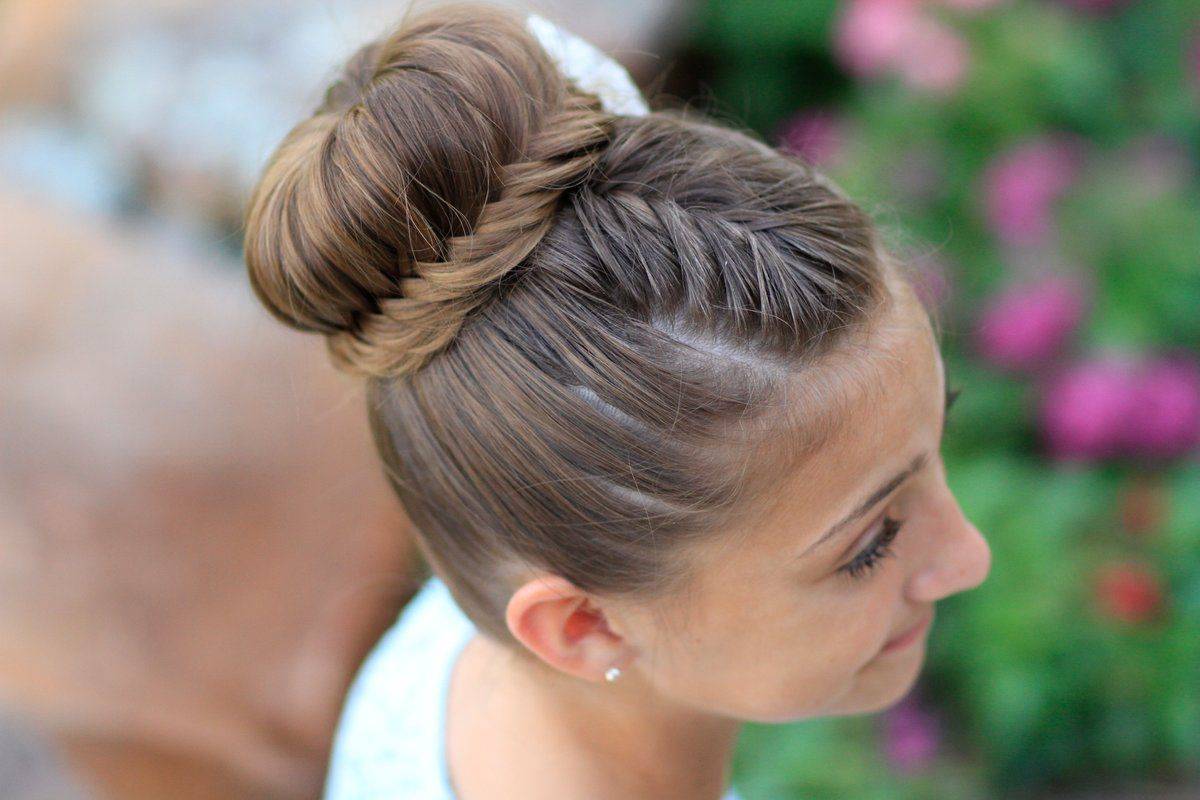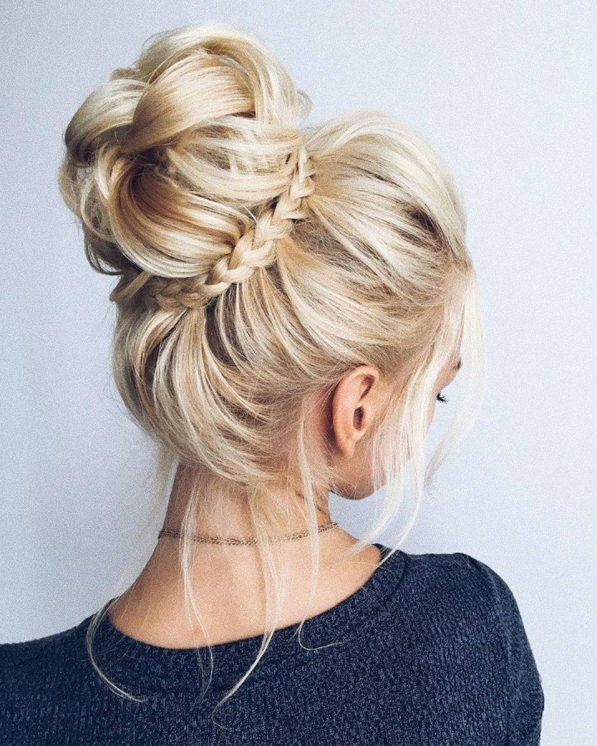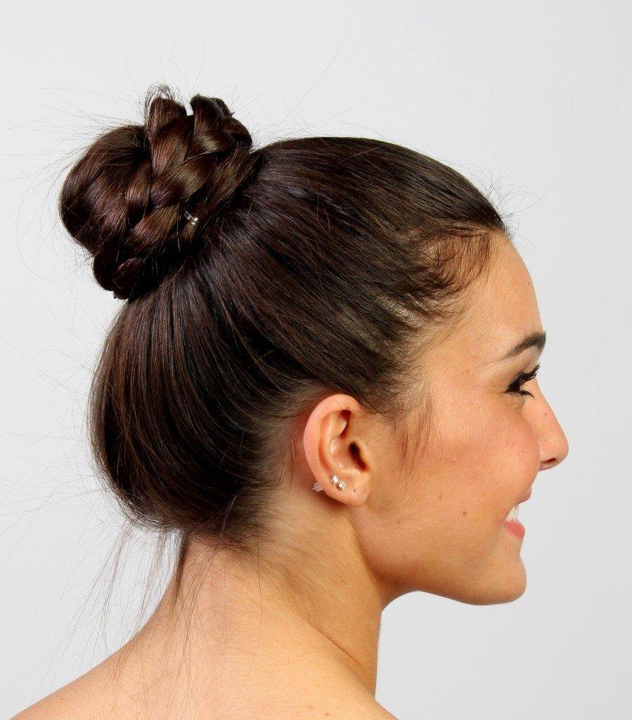 Самый простой вариант в данном случае — пучок с косичками. Прежде, чем приступить к его созданию, помойте волосы и дождитесь высыхания. Не опасайтесь использовать различные средства, которые сделают их более мягкими. Это значительно упростит процесс создания прически. Далее, как и в классическом варианте, необходимо собрать их в хвост и зафиксировать резинкой. Отдельно оставьте несколько прядей по разным сторонам. Надев сверху бублик на хвост, заверните волосы вокруг него. Оставшиеся пряди можно просто закрутить вокруг пучка. Благодаря чему прическа получается строгой, сдержанной. Также их нередко используют для создания косичек необходимой толщины и объема. Нередко модницы делают французское плетение, которое придает прическе нотку романтичности. Кончики обязательно зафиксируйте невидимками.