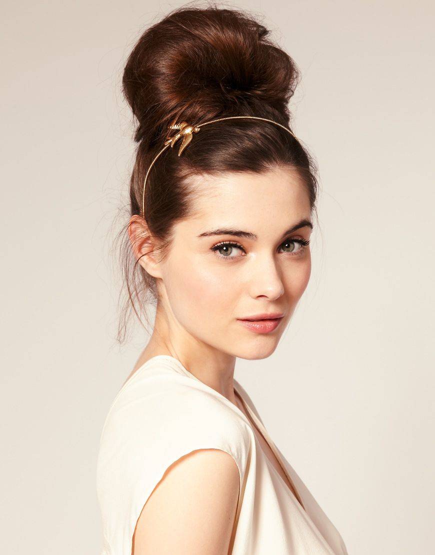 Если вам необходима прическа на торжественное мероприятие, то вы можете обыграть пучок с помощью диадемы или металлического ободка, украшенного камнями или металлическими узорами и литьем. Тонкие металлические ободки, украшенные стразами, очень красиво смотрятся на волосах.