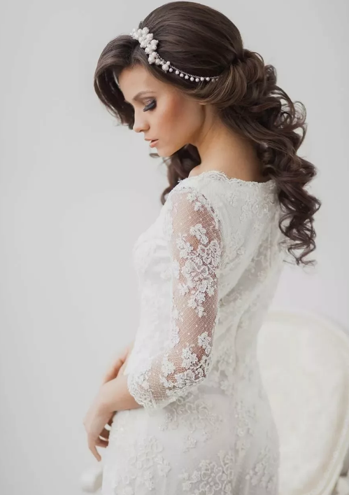 Для брюнеток крупные локоны, распущенные или собранные с помощью ленты, жемчужной нити и прочих украшений, являются классическим вариантом свадебной прически. Эта укладка подходит для средних и длинных волос. Спадающие на плечи закрученные плойкой пряди с добавлением белоснежных декоративных элементов смотрятся эффектно, нежно и невинно в одно и то же время.