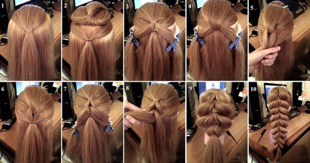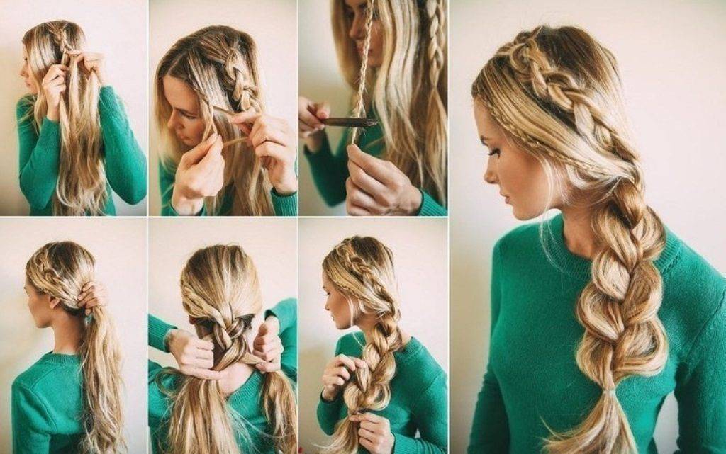 Если классическая техника плетения французских кос оказалась вам не под силу, то не нужно отчаиваться. Сделать шикарную косу вам помогут обычные резиночки. Такую косу можно украсить яркой заколкой или необычной резинкой. Подобные прически пошагово представлены на фото ниже.