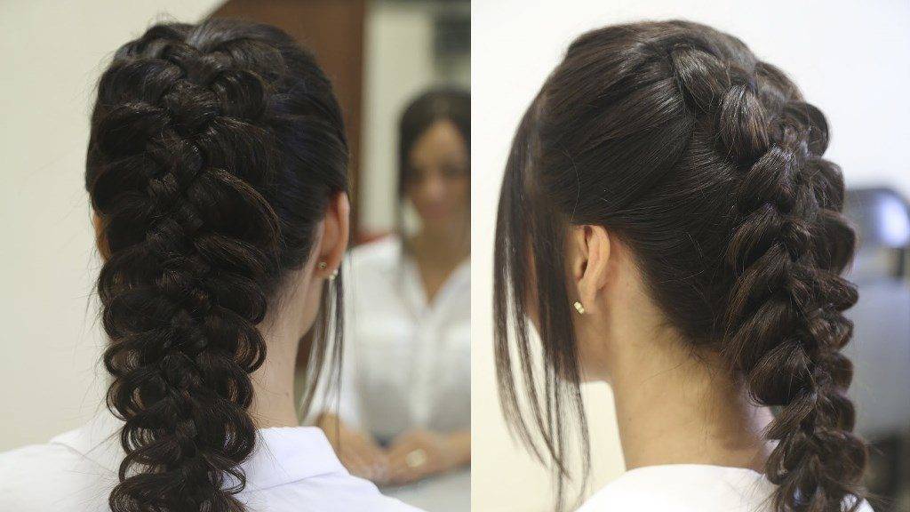 Подобные объемные косы можно плести строго горизонтально, делать две косы или укладывать плетение на голове волной в виде буквы S. Свободную часть косы можно уложить спиралью и закрепить шпильками в виде цветка.