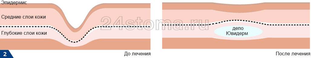Ювидерм вводится в кожу при помощи шприца и очень тонкой иглы. Причем, чем меньше будет плотность филлера – тем более тонкая игла идет в комплекте. Более плотные филлеры могут быть введены в ткани только через иглы чуть большего диаметра, что может быть более болезненным и немного чаще приводить к развитию гематом. Все филлеры Ювидерм выпускаются с содержанием 0,3% анестетика лидокаина. При коррекции морщин гель вводится в основание каждой морщинки, вдоль всей ее длины. Таким образом, филлер как бы выталкивает морщину наружу (рис.4).