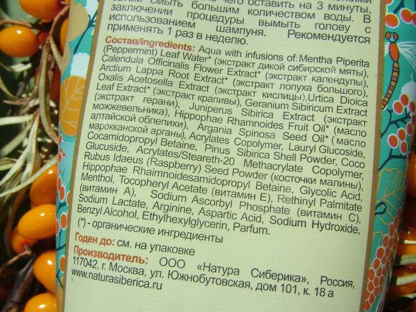 Важно! Вся косметика от Natura Siberica создана на основе экстрактов и масел из натуральных трав и ягод, что может вызывать аллергическую реакцию. Поэтому следует протестировать продукт перед применением.. В состав облепихового скраба для кожи головы включен ряд активных органических компонентов, среди которых: