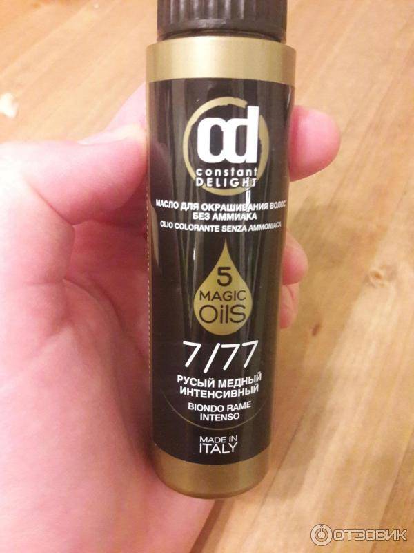 В наши дни эти полезные и 100% природные масла можно отыскать в составе некоторых красок, к примеру, в профессиональных средствах от Constant Delight для качественной окраски. В таком красителе аммиак, что негативно влияет на состояние шевелюры, заменён на уникальный масляный активатор цвета. Пигмент достаточно глубоко сможет проникнуть в ваши волосы, полученный оттенок также очень долго будет оставаться на прядях, волоски насытятся витаминными комплексами, станут более мягкими и приобретут роскошный блеск.