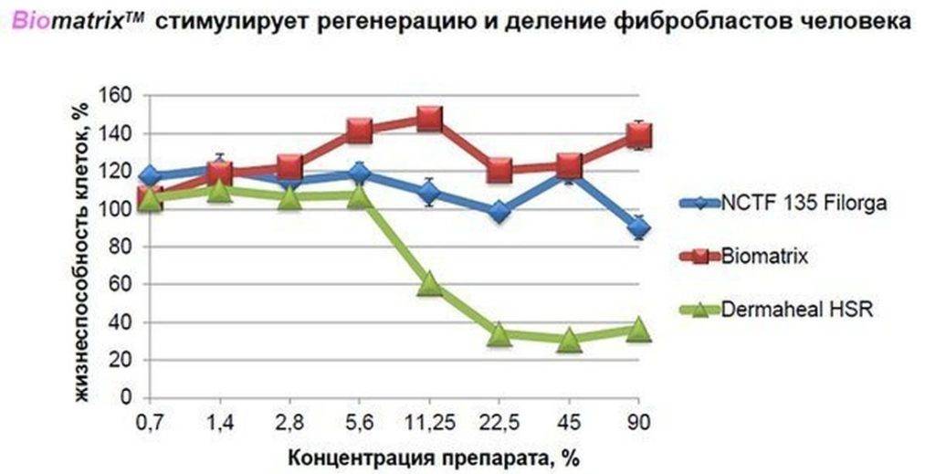 Полученные результаты свидетельствуют о том, что Biomatrix уже при концентрации от 2,8% работает эффективнее, чем NCTF 135, стимулируя восстановление и деление фибробластов человеческой кожи. Корейский аналог эффективен только в дозе до 5,6%. При превышении концентрации доля жизнеспособных клеток резко снижается с 90% до 40 %.