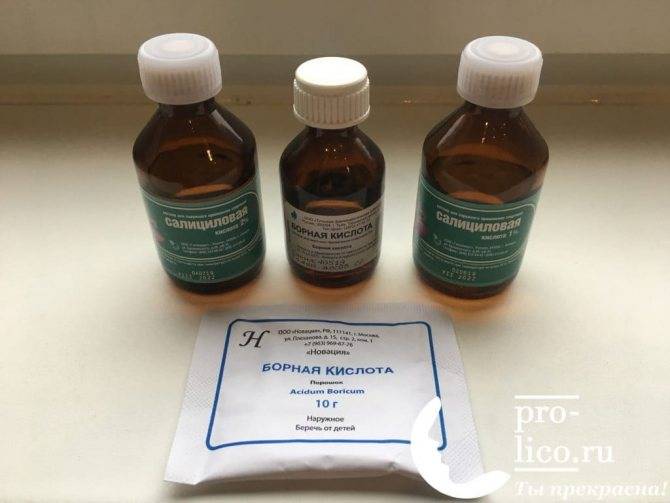 Борная и салициловая кислоты — первая выступает антисептиком и хорошо очищает кожные покровы, вторая способствует заживлению имеющихся ранок, а еще уменьшает выделение кожного сала.