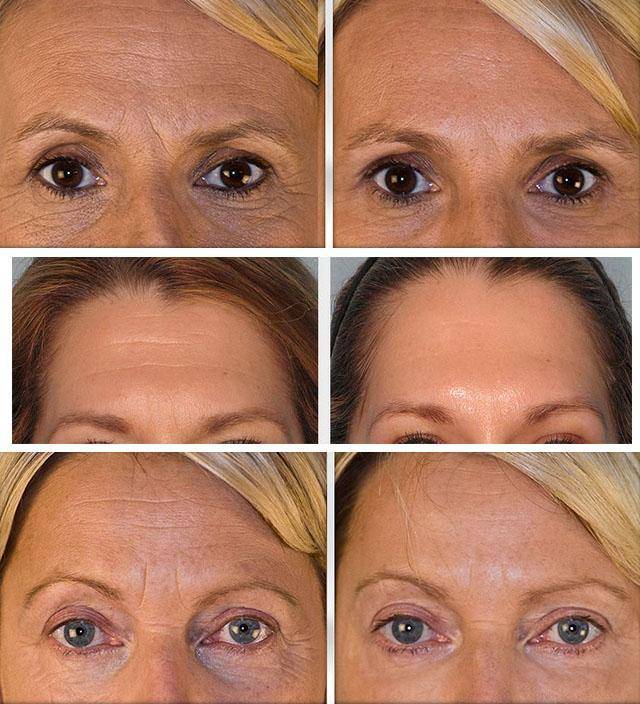Под влиянием дозированного введения препаратов ботулотоксина (Ботокс, Диспорт, Ксеомин) легко разглаживаются даже стойкие и глубокие лобные, периоральные (вокруг рта), периорбитальные и межбровные морщины. Коррекция мимических морщин диспортом и ботоксом высокоэффективна в сочетании с сеансами введения препаратов гиалуроновой кислоты.