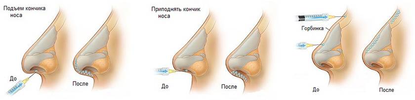 Безоперационная пластика дефектов кончика носа филлерами не проводится, потому что гель в этой зоне плохо распределяется и может принять форму шарика, поэтому коррекция вздернутого или опущенного носового кончика проводится только хирургическим путем.